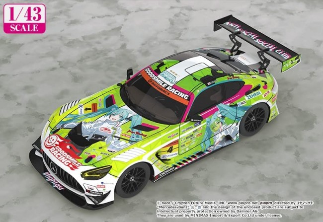 Plastic or resin racing car model (finished product) (or die-cast, etc.) The long-awaited new machine is here! A 1/43 scale miniature of the "Good Smile Miku Hatsune AMG" racing car that will be competing in the GT300 class of "SUPER GT" in 2022. The coloring of the car, which was designed by neco, "Miku Hatsune Racing Ver. 2022", has been precisely reproduced. The body is made of resin. Painted resin (PU) miniature car. 1/43 scale Overall length: approx. 110mm Height: approx. 28mm Sculptor MINIMAX The images shown are computer graphics under development. The actual product will be reflected in the design of the opening round specifications. The photos shown may differ slightly from the actual product. (From Good Smile Company website)