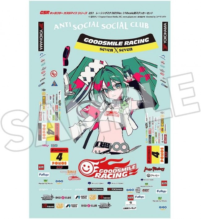 Water Transfer/Dry Decals for Car & Bike Models Sticker set to faithfully recreate the 2025 specification GT machine GSR Character Customization Series 051 Racing Miku 2025 Ver. Sticker Set for 1/10 Scale The “Hatsune Miku Racing Ver. 2025” version joins the GSR Character Customization stickers, perfect for dressing up your 1/10 scale RC models! Not only can you recreate GT machines, but applying these to everyday items lets you feel closer to Hatsune Miku. High weather resistance for color fade resistance. Features material that conforms better to curved surfaces and is easier to apply. Made in Japan for reliability. Product Specifications Title Hatsune Miku GT Project Specifications Size: 240x370mm (2 sheets), 240mmx490mm (1 sheet), 1/10 scale compatible PVC material sticker set Manufacturer Good Smile Racing Distributor Good Smile Company (C) Kei Mochizuki / Crypton Future Media, INC. www.piapro.net directed by Shigeto Koyama Important Notes About the Product Images are for illustrative purposes only. Actual product may differ. (From the Good Smile Company website)