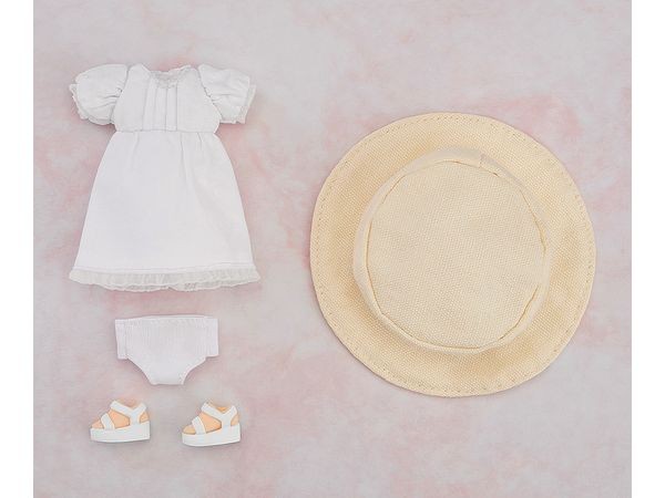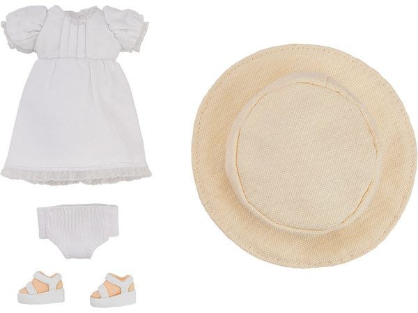 Accessory Parts for Figures A simple hat-included dress joins the clothing set lineup! A simple hat-included dress has arrived for the Nendoroid Doll clothing set! Enjoy combining it with your existing Nendoroid Dolls. 【Set Contents】 Dress Undergarments Hat Sandals (with magnetic soles) ※Figure body and torso not included. Product Specifications Series Name Nendoroid Doll Specifications Fabric, magnet, plastic. Pre-painted completed product. Prototype Production Nendoroon Production Cooperation Sawada Kobo Costume & Pattern Production Suzuko Nagasaki Manufacturer Good Smile Company Distributor Good Smile Company (C) GOOD SMILE COMPANY Important Notes About the Product The photos shown are of sample products. Actual product specifications may differ in part. Prolonged wear may cause color transfer onto the base body. Please be aware. Depending on the design of your existing Nendoroid Doll or clothing items, some may not fit properly. Please understand. (From the Good Smile Company website)