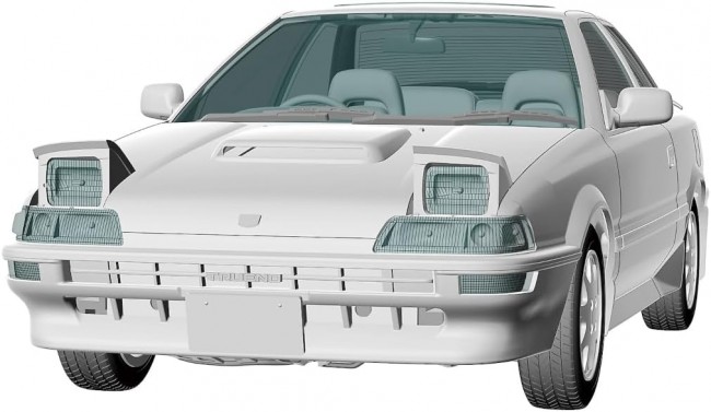 High-Performance Elegance: The “Qunee” Trueno Arrives!! Featuring the Supercharged 4A-GZE Engine Faithfully Reproduces the Late-Model Top-Tier “GT-Z” Grade Based on Actual Vehicle Research Based on thorough research of the actual vehicle, this kit recreates the late-model AE92 Trueno GT-Z released in 1989. It reproduces the model by adding numerous new parts based on the Levin. Features the optional moonroof (sunroof) specification, Choice of aluminum wheels or standard wheels, Retractable headlights are openable. Body parts color is white. Headlight/tail light lenses, parking light/fog light lenses, Aluminum wheels/standard wheels are chrome-plated parts. Window decal sheets are included. 【New Plastic Parts】 ■Body (with moonroof) ■Front bumper ■Hood with air intake bulge ■Retractable headlights ■Headlight/tail light lenses ■Sunroof ■Windshield ■Headlight/tail light mirror surfaces ■Parking light/fog light mirror surfaces 1:24 Scale Automobile [Plastic Model][New Product][New Mold Added] Scale: 1:24 Part Number: HC69 Model Length: 178mm Model Width: 78mm (From Hasegawa website)