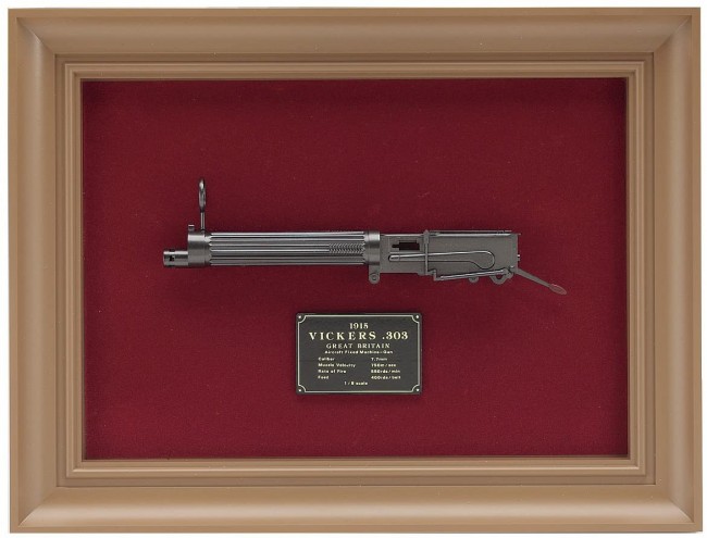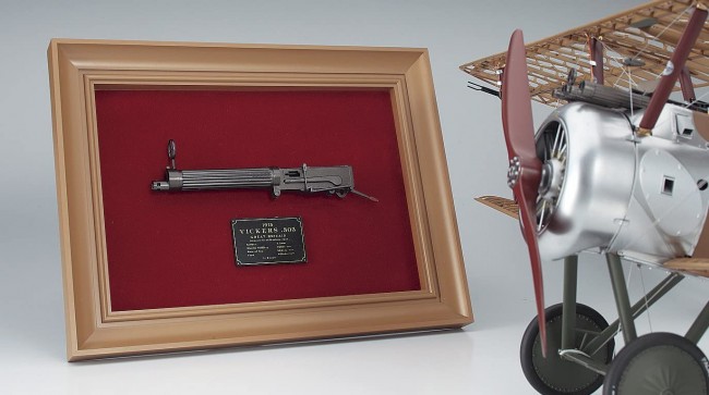 A 1/8 scale model of the Vickers 7.7mm machine gun (1915 model) mounted on the upper part of the nose of the Sopwith Camel F.1.