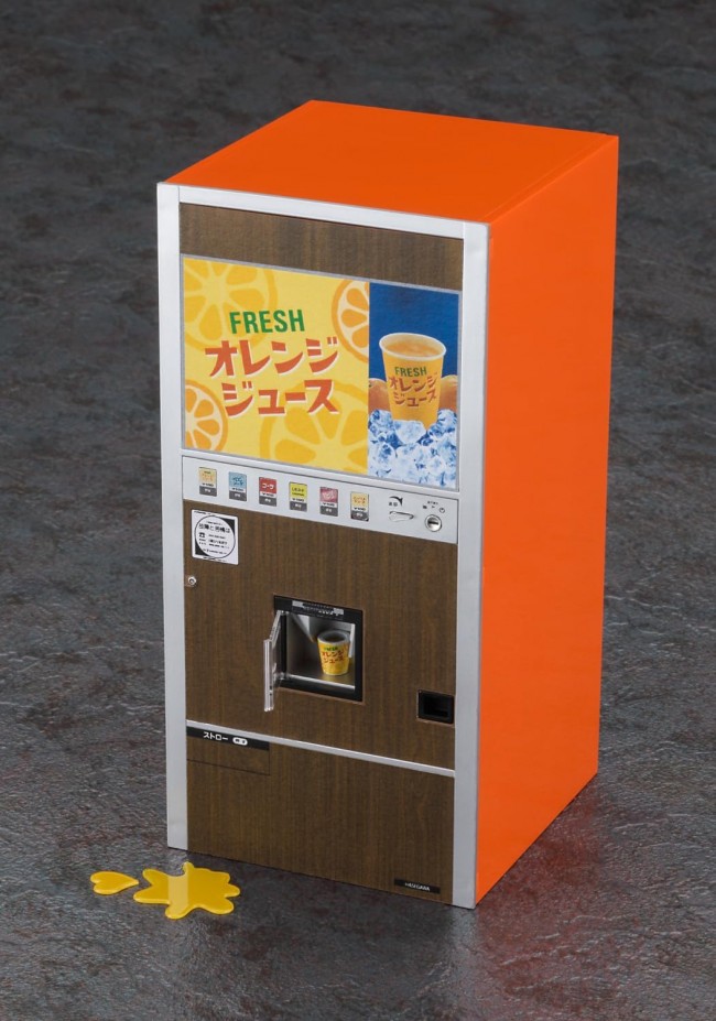 Kit of nostalgic cup juice vending machine! No glue required for assembly. Parts come in orange, black, light gray, and clear. Two cups of juice and two straws are included! Main panel display, button display, and wood grain pattern are reproduced with stickers. *Designs are under development and may differ in some cases from the product. Sticker Main panel display Button display Wood grain pattern, etc. Additional plastic parts Product button panel / Button Straws x 2 Drink contents with ice x 2 / Drink contents without ice x 2 Spilled juice / Heart-shaped spilled juice Retro Vending Machine (Cup Juice) [Plastic model][Limited Edition][New sticker][New mold added]. Scale ... 1:12 Part number ......... 62206 Model height ... 150mm Model width ... 72.5mm (From Hasegawa website)