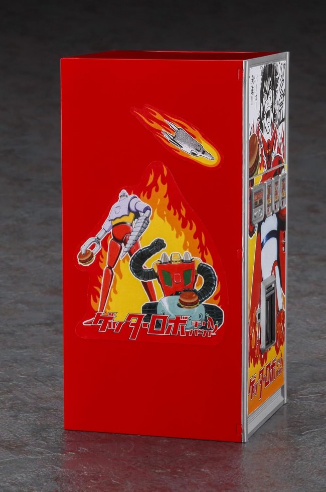 Getter Robo (Manga Edition) and Retro Vending Machines in a Super Hot Collaboration! An original design “Hamburger” vending machine featuring illustrations and logos from “Getter Robo” is now available as a kit. The design features illustrations of mecha and characters, along with the series logo, on the front and both sides of the vending machine. Parts colors are red, light gray, and clear. No glue required for assembly. The product dispensing hatch is movable. Two hamburger boxes are included. Decals ・Getter Robo illustrations ・Logo ・Switches, etc. [Plastic Model][Limited Edition][New Decals] Scale: 1:12 Part Number: SP667 Model Height: 150mm Model Width: 72.5mm (C)Go Nagai・Ken Ishikawa/Dynamic Planning (From the Hasegawa website)