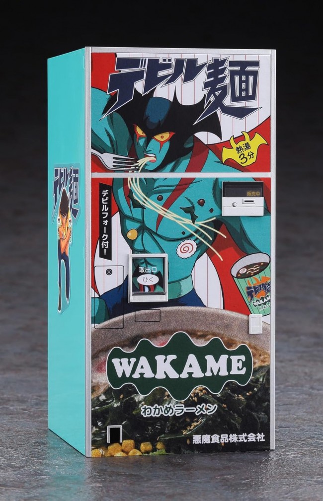 Devilman and Retro Vending Machines Collaborate! An original-design cup noodle vending machine featuring Devilman illustrations on the front is now available as a kit! Its name? “Devil Noodles”!! No glue required for assembly. The product dispensing opening is movable. Includes two cup noodles and two fork parts. Stickers ・Original wrapping sticker featuring Devilman illustrations [Plastic Model][Limited Edition][New Sticker] Scale: 1:12 Part Number: SP686 Model Height: 150mm Model Width: 72.5mm (C)Go Nagai/Dynamic Planning Illustration by Kazuhiro Ochi (From the Hasegawa website)