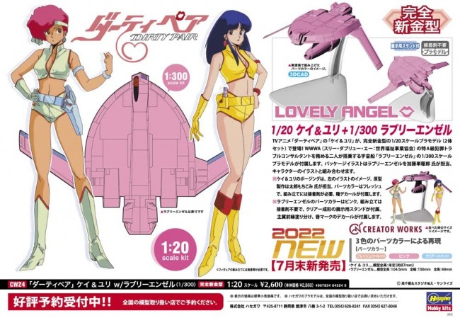 Plastic Model Scale] 1/20 Size] Lovely Angel model length 104.5mm / width 156mm 1/20 plastic model of Kay & Yuri is here! The spaceship "Lovely Angel (1/300)" is included. Kay & Yuri from the TV anime "Dirty Pair" are now available as a completely new 1/20 scale plastic model (set of 2)! A 1/300 scale plastic model of the "Lovely Angel," the spaceship on which they serve as special Class-A crime trouble consultants for the WWWA (Three Devils Association: World Welfare Workers Association), is included. The prototype was produced by Taro Mochikomi. The parts color is fresh, and adhesives are required for assembly. (Total height of the model: undecided (approx. 87mm)) Lovely Angel's parts color is pink. Assembly requires no glue and comes with a clear molded display stand. (Model length: 104.5mm, width: 156mm, height: 49mm) Lovely Angel will be packaged by Kato Kanjiro, who will combine illustrations of the characters. Decal Figure: Eye decal Lovely Angel: Separate painting of the leading edge of the main wings and markings on the lips