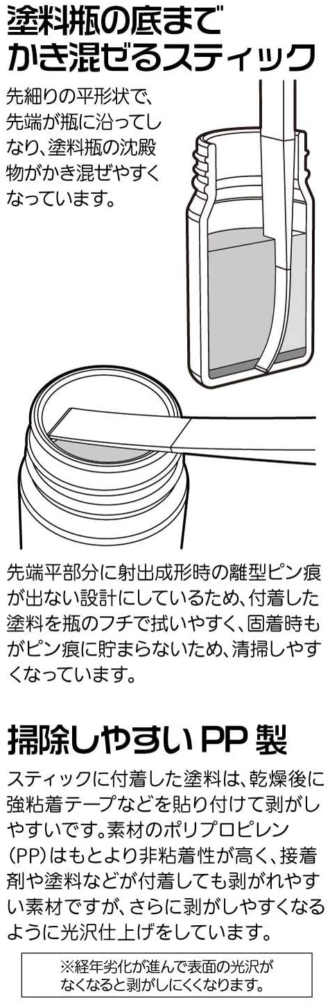 It is designed so that the release pin marks do not appear on the flat tip at the time of injection molding, so it is easy to wipe the attached paint with the edge of the bottle, and even when it sticks it does not accumulate in the pin marks, making it easy to clean.