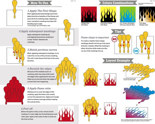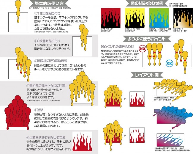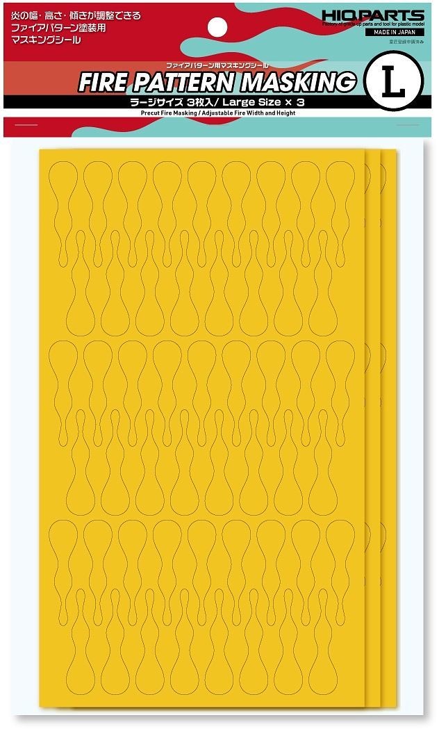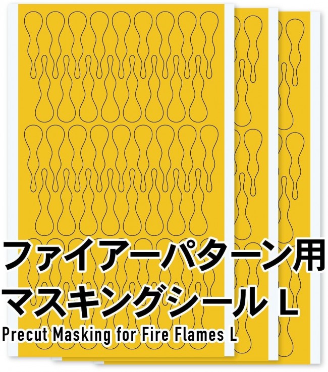 3 pieces [Size] Sheet: (approx. 133 x 228 mm) For fire pattern painting only Pre-cut masking sticker that can change the shape and width of the flame The masking sticker for fire pattern is a pre-cut masking sticker whose shape and width can be changed according to the target. The point is a gourd-shaped pre-cut sticker. By arranging them in a staircase pattern, you can easily create a thin and flowing flame pattern. Because it is a method that can mask the surroundings of the flame, it goes well with airbrush painting, and you can express fine details such as gradation and mesh.