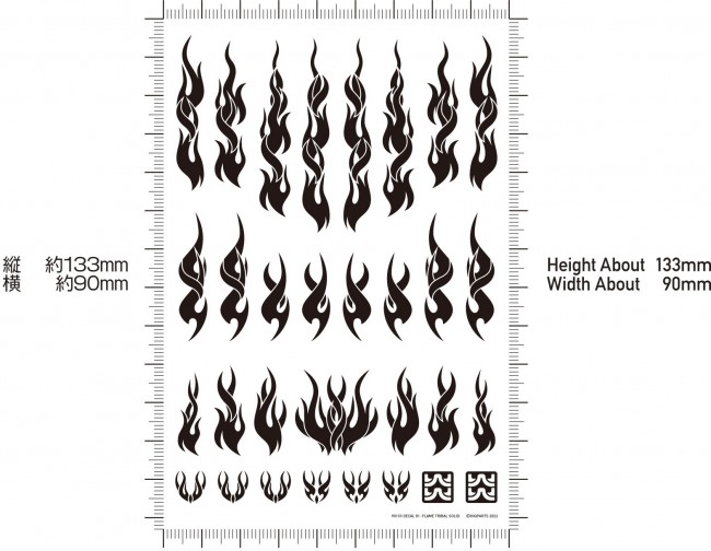 Water transfer/dry decals for car and motorcycle models New generation design with a sleek finish! Even the paint job has its own charm! Many of the traditional fire pattern decals have a retro design, and it has been difficult to find ones that fit in with today's dress-up styles. These decals are a new generation design that mixes a traditional fire pattern with a tribal design. The intricate streamlined pattern, which is difficult to achieve with paint, can be dressed up with water-transfer decals. The decal has a mechanism that allows the paint color to be seen through the gaps in the pattern, providing a fun way to think about the combination with the paint color. Printing is by silk-screen printing and features even coloring. Intended for dressing up 1/24 to 1/32 scale car models. Size: 90 mm x 133 mm Printing: Silk screen printing Country of origin/ Made in Japan