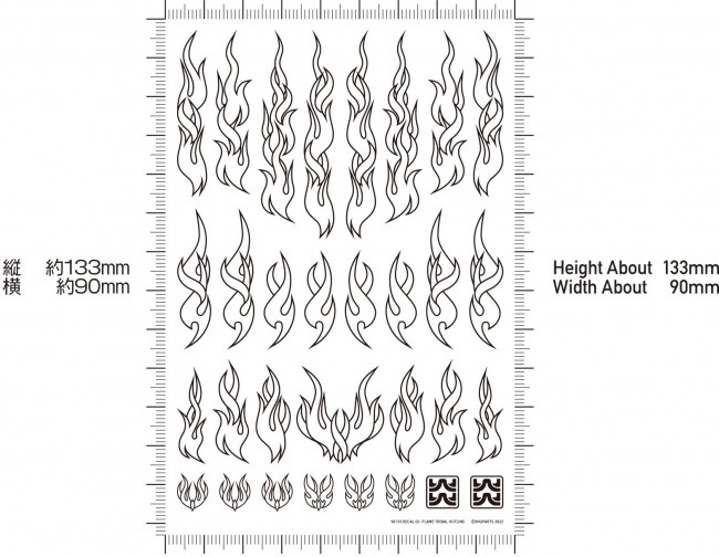 Water transfer/dry decals for car and motorcycle models New generation design with a sleek finish! Even the paint job has its own charm! Many of the traditional fire pattern decals have a retro design, and it has been difficult to find ones that fit in with today's dress-up styles. These decals are a new generation design that mixes a traditional fire pattern with a tribal design. The intricate streamlined pattern, which is difficult to achieve with paint, can be dressed up with water-transfer decals. The decal has a mechanism that allows the paint color to be seen through the gaps in the pattern, providing a fun way to think about the combination with the paint color. Printing is by silk-screen printing and features even coloring. Intended for dressing up 1/24 to 1/32 scale car models. Size: 90 mm x 133 mm Printing: Silk screen printing Country of origin/ Made in Japan