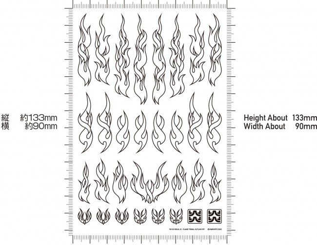 Water transfer/dry decals for car and motorcycle models New generation design with fluid finish! Even the paint job has its own charm! Conventional fire pattern decals have a retro design and it has been difficult to find one that fits with today's dress-up styles. These decals are a new generation design that mixes a traditional fire pattern with a tribal design. The intricate streamlined pattern, which is difficult to achieve with paint, can be dressed up with water-transfer decals. The decal has a mechanism that allows the paint color to be seen through the gaps in the pattern, providing a fun way to think about the combination with the paint color. Printing is by silk-screen printing and features even coloring. Intended for dressing up 1/24 to 1/32 scale car models. The color of the product image and the actual product may differ. Please note in advance. Size 90mm x 133mm Printing Silk screen printing Country of origin/ Made in Japan