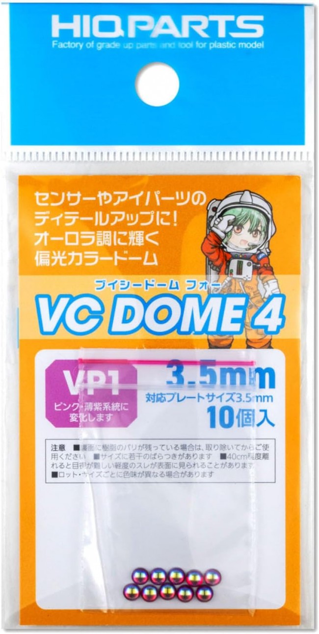 For detailing sensors and eye parts! Polarized color dome with aurora-like shine VC Dome (Variable Color Dome) is a dome-shaped detail-up part that adds sparkle and a sense of luxury to models. The hemispherical resin with polarized coating allows you to enjoy the beauty of colors that change depending on the angle you look at it from. A metal plate is also incorporated on the back side of the resin to enhance the reflective effect. In combination with the separately sold “SP Plate” and “HD Plate,” installation becomes even easier and the overall high-end appearance of the model is further accentuated. For adhesion, we recommend a whitening-resistant adhesive. VP1 Color: Changes to pink and light purple system depending on viewing angle Diameter 3.5mm 10 pieces