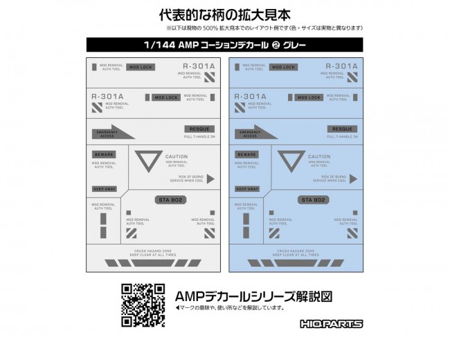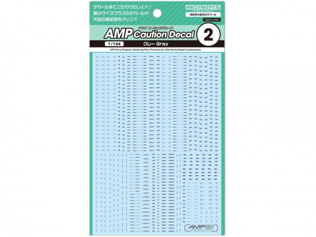 For those who want to perfect every detail, down to the decals! Ultra-small decals enhance the precision of your work!! The AMP water-slide decal series for mechanical models features a redesigned lineup to accommodate the increasingly detailed parts found in modern mechanical model kits. Centered around standard designs with minimal ornamentation, these decals heighten your model's precision and visual detail. While maintaining sufficient legibility, please refer to the text explanations in the blog to select the optimal placement locations. Despite their micro size, they feature high-definition printing that colors details without compromising the model's scale, maximizing the appeal of your build. Additionally, these gloss decals are “polish-compatible,” minimizing cloudiness in the clear coat layer during gloss finishing. AMP Caution Decal 01: “01” offers high versatility, featuring many frequently used patterns. AMP Caution Decal 02: “02” is highly versatile and includes many patterns with strong accent effects. Use in combination with “01”. AMP Caution Decal 03: “03” includes medium-sized and long-text markings. Use in combination with “01” and “02”. AMP Caution Decal 04: “04” includes large, numeric, and long-text markings. Use in combination with “01”, ‘02’, and “03”. Explanatory articles about the decal text and designs are published here: https://hiqparts.info/amp-ref Water Transfer Decals Size/110mm x 156mm Country of Origin/Made in Japan