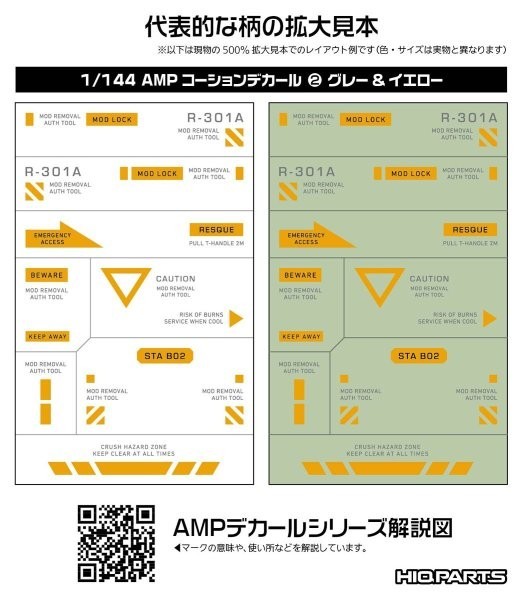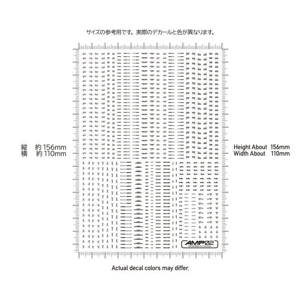 For those who want to perfect every detail, down to the decals! Ultra-small decals enhance your model's precision!! AMP water-slide decals for mechanical models are a new series featuring redesigned patterns to match the increasingly detailed parts found in modern mechanical models. Focusing on standard designs stripped of unnecessary decoration, they heighten your model's precision and visual detail. While maintaining a degree of legibility, please refer to the text explanations in the blog to select the optimal placement locations. Despite their micro size, they feature high-definition printing. They color details without compromising the model's sense of scale, maximizing the appeal of the model. Additionally, they are gloss decals compatible with polishing, making cloudiness in the clear coat layer less noticeable during gloss finishing. ・Water-slide decals Size/110mm x 156mm ・Country of Origin/Made in Japan ●AMP Caution Decal 02 ・“02” features highly versatile patterns with strong accent designs. Use in combination with “01”.