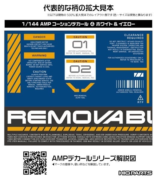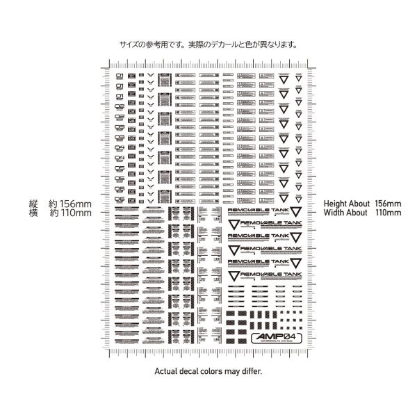 For those who want to perfect every detail, down to the decals! Ultra-small decals elevate your model's precision and detail!! AMP water-slide decals for mechanical models feature a redesigned series to match the increasingly intricate parts of modern mechanical models. Focusing on standard designs stripped of excessive ornamentation, they enhance your model's precision and visual information density. While maintaining a degree of legibility, please refer to the text explanations on our blog to select the optimal placement locations. Despite their micro size, they feature high-definition printing. They color details without compromising the model's sense of scale, maximizing the appeal of the model. Furthermore, they are gloss decals compatible with polishing, making cloudiness in the clear coat layer less noticeable when applying a gloss finish. AMP Caution Decal 04 “04” includes large, numbered, and lengthy markings. Use in combination with “01”, ‘02’, and “03”. Water Transfer Decals Size/110mm x 156mm Country of Origin/Made in Japan