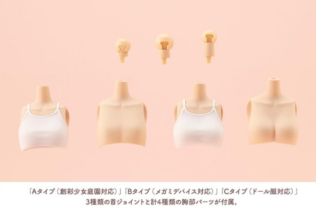 Small parts and accessories for figures The popular dress-up body is now available in size S for a short height type! The set includes two types of body parts: a “relaxed wear” type and an “inner wear” type, and you can also choose between two different bust sizes: a “slender type” and a “regular type”. The simple yet highly movable structure is recommended as an elemental body for modification. Points of particular interest Two types of body types This product comes in a set of two types of body parts. The head of the Sosai Shoujo Teien series is not included. The body is designed to be approximately 140mm in height when the Sosai Shoujo Garden head is used. Relaxing Wear is modeled wearing a short length camisole and shorts, and is designed to give the impression of relaxing in one's home. The inner wear type is designed to be worn with the Tiny Closet (Kotobukiya Limited Edition) sold separately, or with various doll clothes made for 14cm models. The dolls are smaller than the size M dolls, so you can dress them up in a wide range of clothes. Two different bust sizes are available. Two types are available for both “relax wear” and “inner wear”: a “slender type” that matches the image of “Emma Koishikawa” and a general-purpose “regular type. Please use them according to the image you want to produce. Three types of neck joints with different lengths Three types of neck joints are included: “A type (for Sosai Shoujo Teien)”, “B type (for Megami Device)” and “C type (for doll clothes)”. The B type has a slightly longer neck than the A type to accommodate the head of the Megami device. The C type has an even longer neck than the B type and is used to prevent the neck from being buried by the collar of the doll outfit. The ball joint diameter of the neck comes in two types: 5mm type and 6mm type, The 5mm type is compatible with “Sosai Shoujo Teien”, “Arcanadia”, “Frame Arms Girl” and “Mugen KAIKOUMARIA”, The 6mm type is compatible with “Megami Device”. Slide joint of the neck】 【Slide joint of the neck】. The joint of the neck is a type with a sliding back and forth gimmick, which is used for Kiku Kochiyu [Swimsuit], and can be used for “Pulling the chin”, “Looking”, and “Looking back”. The joints are also designed to improve the vertical movement gimmicks such as “pull chin” and “look up”, It can also be used to avoid interference by the hair. Socks available in a variety of types. The socks can be selected from “short socks,” “high socks,” or “over-the-knee socks,” and are interchangeable from the knees down. The thighs used for the short socks and high socks types are shared with the bare leg type. Molding color of the body The body is molded in Skin Color A, which is used in many “Sosai Shoujo Teien” products, It can be combined with “Arcanadia”, “Frame Arms Girl”, “Megami Device”, etc. ▼Accessories 1) Relaxed wear type torso x 1 2)Inner wear type torso x 1 3)Bust parts (Slender type) for Relax Wear×1 4)Bust parts (slender type) for inner wear×1 5)Bust Parts (Regular Type) for Relaxed Wear×1 6)Bust parts (regular type) for inner wear×1 7)Short socks leg parts x for left and right 8)High Socks Leg Parts (Left/Right) 9)Over-Knee Socks Leg Parts x Left/Right 10)Bare Legs parts (for left and right) 11)7 kinds of wrist parts: “Normal handle”, “Narrow handle”, “Wide handle”, “Round handle”, “Grip hand”, “Pointing hand”, “Flat hand” x left and right (Since the included wrist is one set, the same wrist parts cannot be used for both relaxed wear and inner wear types.) 12)Neck Joint A type (for Relax Wear) x 1 13)Neck Joint A type (for inner wear) x 1 14)Neck Joint B type (for relax wear) x 1 15)Neck Joint B Type (for inner wear) x 1 16)Neck Joint C type (for relax wear) x 1 17)Neck Joint C type (for inner wear) x 1 18)Neck ball joint 5mm type x 2 19)Neck ball joint 6mm type x 2 20)Optional ankle joint [skin color A] x left and right (Compatible with sandals and ankles included with Madoka [Swimsuit] Calendar [Swimsuit] Ritsuka [Swimsuit]) 21) Optional ankle joints [white] x for left and right (Can be painted to connect ankles and shoes of Emma [Uniform]. (C) KOTOBUKIYA ----- Works Sosai Shoujo Teien Series Character Plastic Model Scale 1/10 Product size Total height: approx. 121mm The image is a prototype. It may differ slightly from the actual product. It has been painted for the purpose of photography. (From Kotobukiya website)
