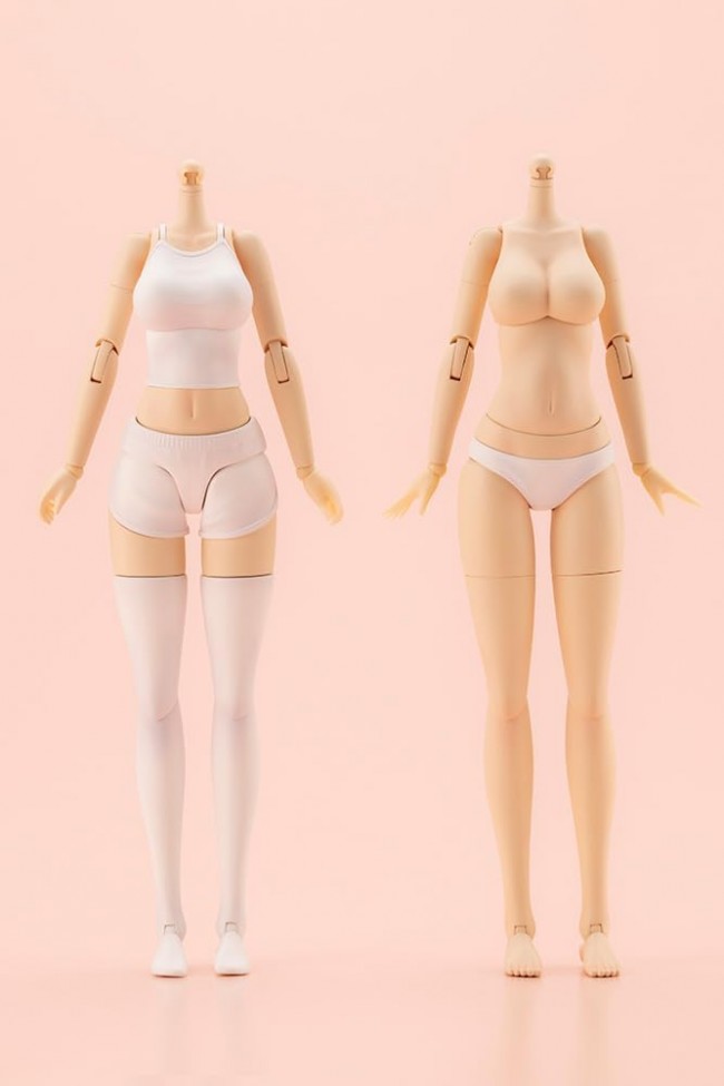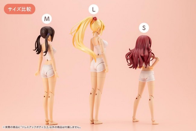 Accessories and parts for figures The popular “Dress Up Body” series now comes in L size! Have fun dressing it up in all kinds of outfits! The proportions are based on Ritsuka Saeki, and the total height is approximately 160 mm with the head attached. Recommended for users who prefer glamorous proportions. Like the currently available M size, this set includes two types: “Relax Wear” and “Inner Wear.” With its simple yet highly movable structure, it is recommended as a base body for customization. ▼Key Features 【Two Body Types】 This product includes two types of base bodies. ※The head from the S?sai Sh?jo Teien series is not included. The Relax Wear type features a short camisole and shorts, designed for a relaxed, at-home look. and is designed to be played with in a relaxed, at-home setting. The Innerwear type is designed to be worn with various doll clothes made for 15cm to 16cm models, such as the separately sold Tiny Closet (Kotobukiya limited edition). *Please note that depending on the design and product specifications, some clothes may not fit. 【3 Types of Neck Joint Lengths】 Three types are included: “Type A (compatible with S?sai Sh?jo Teien),” “Type B (compatible with Megami Device),” and “Type C (compatible with doll clothing).” Type B has a slightly longer neck than Type A to accommodate the head of Megami Device. Type C has an even longer neck than Type B to prevent the neck from being covered by the collar of doll clothing. Additionally, two types of neck ball joint diameters are included: “5mm Type” and “6mm Type.” The 5mm Type is compatible with “S?sai Sh?jo Teien,” “Arcanadia,” “Frame Arms Girl,” and “Mugen Kaik? Megalomaria,” while the 6mm Type is compatible with “Megami Device.” 【Neck Slide Joint】 The neck joint adopts the type with a sliding mechanism front and back, as used in Kotori Tsukuyomi [Swimsuit], which improves the up-and-down movement mechanism such as “tucking the chin” and “looking up,” and can also be used to avoid movement interference caused by hair. 【Selectable Sock Types】 Sock types can be selected from “short socks,” “high socks,” and “over-the-knee socks,” with the entire lower leg being replaceable. ※The thighs used with the short sock type and high sock type are shared with the barefoot type. 【Body Color】 The body color adopts Skin Color A, widely used in “S?sai Sh?jo Teien,” allowing it to be combined with “Arcadia,” “Frame Arms Girl,” “Megami Device,” and other series for play. ▼Accessories 1) Relaxed Wear Type Torso ×1 2) Inner Wear Type Torso ×1 3) Short Sock Leg Parts ×Left and Right 4) High Sock Leg Parts ×Left and Right 5) Over-the-Knee Sock Leg Parts ×Left and Right 6) Barefoot Parts ×Left and Right 7) Wrist parts (7 types): “Standard grip,” “Narrow grip,” “Wide grip,” “Round grip,” “Closed fist,” “Pointing finger,” and “Flat palm” × left and right sides each (Since only one set of wrist parts is included, both the Relax Wear and Inner Wear types cannot use the same wrist parts) 8) Neck joint A type (for Relax Wear) × 1 9) Neck joint A type (for innerwear) × 1 10) Neck joint B type (for relaxed wear) × 1 11) Neck joint B type (for innerwear) × 1 12) Neck joint C type (for relaxed wear) × 1 13) Neck joint C type (for innerwear) × 1 14) Neck ball joint 5mm type × 2 15) Neck Ball Joint 6mm Type ×2 16) Optional Ankle Joint ×Left and Right (Compatible with sandals and ankles included with Madoka [Swimsuit], Koyomi [Swimsuit], and Ritsuka [Swimsuit]) 17) Chest Joint Spacer ×2 (C) KOTOBUKIYA ----- Work S?sai Sh?jo Teien Series Character Plastic Model Scale 1/10 Product Size Total Height: Approx. 142mm Product Specifications Plastic Model Number of Parts 51?200 Materials PVC (phthalate-free), ABS, POM Design Proslink Co., Ltd. Product Number JK019 *The image is a prototype. The actual product may differ slightly. It has been painted for photography purposes. (From the Kotobukiya website)