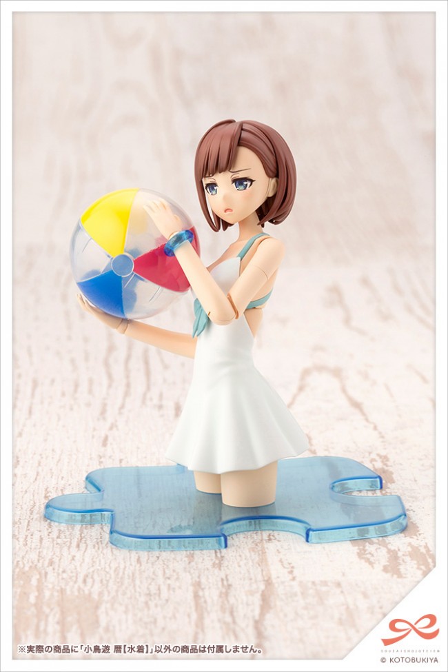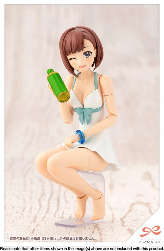 Plastic Assembled Figure Kit Pure white one-piece swimsuit is neat! Koyogi Kotoyu is wearing a swimsuit following her school uniform. The simple one-piece swimsuit is accented with a ribbon at the chest. The back has a bold design with a cross back. Her straw hat with a large ribbon and high-heeled sandals are partially pre-painted and color-coded. She comes with a sitting poseable body and fixed leg parts for natural posing. Points of Attention Movable neck joint]. The ball-jointed neck slides forward and backward, allowing you to pose her looking up or pulling her chin down more naturally than ever before. Body for sitting pose]. The body for Koyomi's sitting pose is based on the theme of "sitting on a chair" or "sitting on a flat surface". The body is designed to look like it is sitting on a chair, or sitting flat on the floor. Fixed leg parts and special stand In addition to the sitting body, the fixed leg parts allow the figure to be posed with knees bent deeper than when using the movable parts. The fixed leg parts can be replaced from the movable thigh roll part, so you can expand the range of poses by using only one leg as a fixed leg part. She can also be displayed in a crouched position by using the body for a seated pose, fixed leg parts, and a dedicated stand. The stand is molded in clear colorless plastic. Newly sculpted hand parts. Newly sculpted wrist parts with a gentle hand expression. The hand parts allow for a variety of poses, such as blocking out the summer sun or placing small objects in the palm of the hand. Clear molded bracelet. The bracelet she wears on her left hand is molded in a clear blue color, and a fine lame material has been added to give it a beautiful finish. [Painted parts] Pre-painted parts are used for her sandals and the ribbon on her straw hat, so simply assemble the figure to create a finished product that is close to the finished sample. Four expressions are included. A newly sculpted "winking face", "staring face", "tongue-tied face" and a smiling face in summer clothes are all included, allowing you to create a variety of different expressions. Barefoot parts are included. She comes with both sandal and barefoot ankle parts. The barefoot type can be used in a normal standing pose, as well as with her toes curled or bowed to create a variety of different expressions. Glasses and exclusive forelock parts She comes with two types of eyeglass parts, one with and one without glasses. She also comes with two types of bangs, one with and one without glasses, allowing you to choose whether to display her with or without her glasses. Three bangs parts are included for each figure. The glasses parts are clear and colorless. To reproduce the finished model, you will need to paint them yourself. Clear blue base for display. The display base will be a clear blue color, which is based on the image of the waterfront. Accessories 1) Kiku Koyu body x 1 set 2) 3 hairstyle parts Bob cut", "Half up" and "Braid" x 1 set each 3)Forelock parts without glasses x 3 4) Attachment parts for arranging bangs x 1 5)Pre-painted expression parts: [winking face], [glazed face], [tongue protruding] and [smiling face (mouth open)] x 1 each 6)Unpainted expression parts: [winking face], [stern expression], [tongue protruding] and [smiling face (mouth open)] x 1 each 7) Straw Hat x 1 set 8) Glasses parts x 3 9)Folded glasses parts x 1 10)8 kinds of wrist parts: "Normal handle", "Narrow handle", "Wide handle", "Round handle", "Grip hand", "Pointing hand", "Flat hand A", "Supporting hand" x 1 for each left and right 11) Body for sitting posture x 1 set 12)Fixed leg parts x 1 set (for left and right) 13)Bare foot parts [Normal], [Fingers rounded] and [Fingers bowed] for each left and right side 14)Megami Device compatible 6mm diameter neck parts x 1 15)Display base x 1 set 16)Water transfer expression decal x 1 sheet (C) KOTOBUKIYA ----- Works Sosai Shoujo Teien Series Character Plastic Model Scale 1/10 Product Size Height: approx. 160mm Product Specifications Plastic model Number of Parts 201-400 Material PS, ABS, POM, PVC (non-phthalate) Design Yunosuke Maruke The image is a prototype. It may differ slightly from the actual product. Also, it has been painted for the purpose of photography. (From Kotobukiya website)