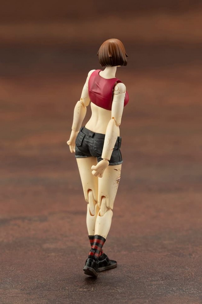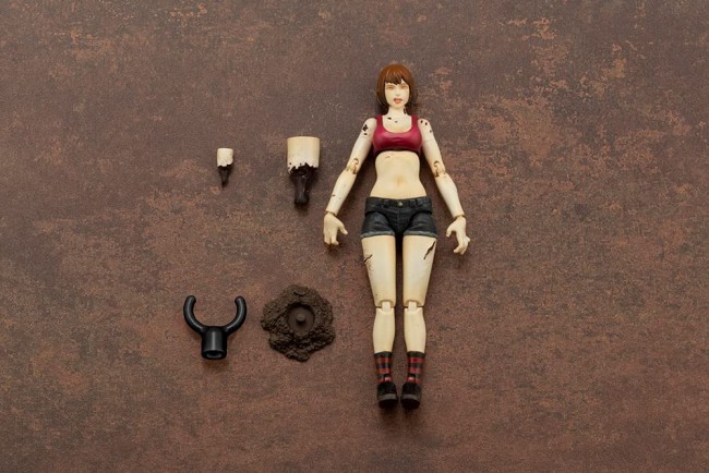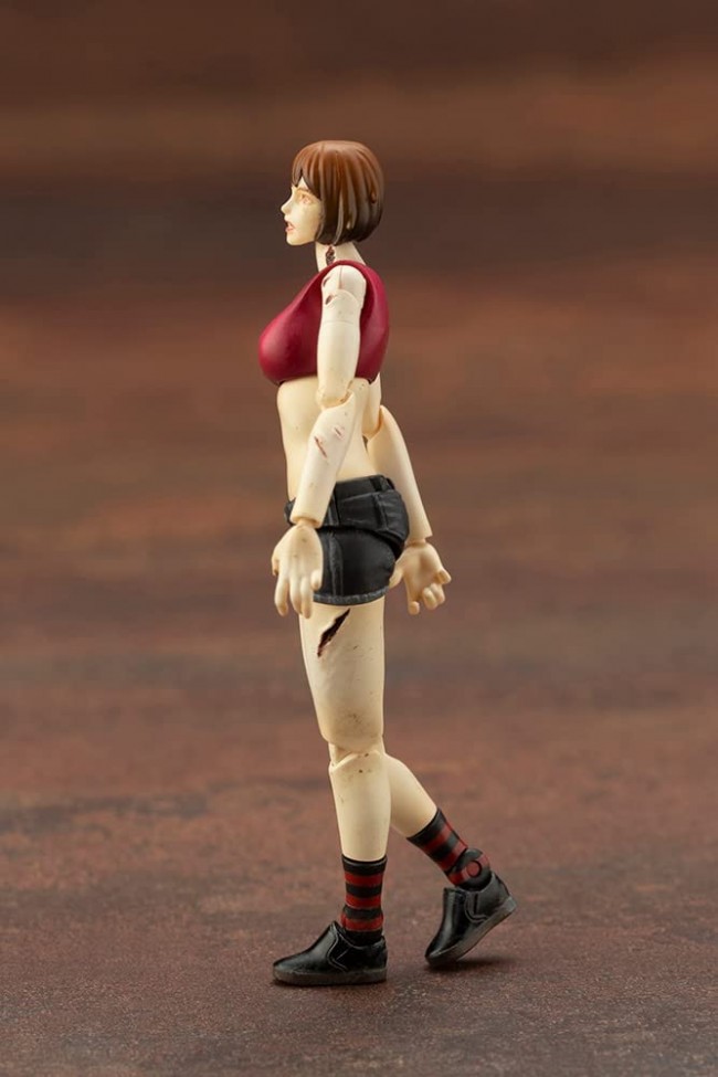 Plastic Sci-Fi/Animation Character Assembly Kit New characters for the new palm-sized movable plastic model series "END OF HEROES"! The 1/24th scale plastic model "END OF HEROES"! We bring you all kinds of outsiders suitable for the devastated world in palm-sized plastic models. Small-scale, fully articulated characters will be right at your desk! The lineup includes zombies, thieves, hunters, and other familiar motifs from horror, action, and science fiction films. With the new characters to be released one after another, it will be like a movie theater right in front of your eyes. Yes, you are the director! Research Report 3: Zombinoid Wretched Girl The unmistakable and bewitching limbs were clearly visible even through the purple smoke that was so thick it was almost intoxicating. Clad in clothing that accentuated their body lines, their seemingly sad and fragile prone figures made even saints (like me) wish for a hot embrace that would lead to death against their conscious will. Yes, these women do not need to be hunted. If they are attracted by the red eyes that still attract them in life, or even in death, the foolish sacrifices will literally offer themselves to them.... The zombies that become their servants are called creepers, and their only thought, or rather instinct, seems to be to catch food for their masters. And as their numbers increase at an accelerating rate, they eventually become an army of the dead, the so-called "hive. The most common case of damage caused by zombies is that they are surrounded by buildings and obstacles that make them blind spots and unrecognizable to humans, but they are already unavoidable. While the threat of a single zombie is low if one is vigilant even in a dangerous area (except for unique individuals), the threat level increases dramatically when a group of zombies gathers. The leched girl seems to be the one who, in her lifetime, used her good looks to unite the downtown rabble and lead a group of outcasts. Not only does her appearance not diminish as she transforms into a zombie, but there are reports of a singular individual with the ability to halt the progression of decomposition and even create the illusion of a pseudo-living person. What's END OF HEROES? In the year 20XX... A world where civilization, order, and even sin have been consumed and collapsed by the flames of transgression caused by the "Great Salvation". In a world where the dead have awakened as on the Day of Judgment written in a discarded prophecy, and their vices have been honored, saints have been transformed into villains, hunters have been transformed into bloodthirsty wolves, and deformed beings that could only exist in the world of the story have roamed the earth.... Product Specifications Although the figure is only 72mm in height, the proportions of the actress in the movie were pursued to reproduce her flowing, curvy figure, and the silhouette was sculpted from illustrator Superlog's design! The body is sculpted with zombie-like bite wounds and lacerations in various parts. The wrist parts are molded with PVC to reproduce the expression of the zombie's rigor mortis. In addition to the proportions, 26 joints are included to recreate the movements and poses of a zombie, allowing the figure to move like a zombie in a movie. The Wretched Girl comes with optional replacement parts for her arms and legs, which can be reconfigured to create your own unique zombie. The joint parts on her back can be connected to a mini flying base (sold separately) to let her jump, blow up, and perform other unique zombie actions. The dirt puddle effect parts commonly included with the Wretched Girl and Fallen Queen can be connected to the arm unit removed from the main body to recreate the scene where the zombie tries to crawl out of the ground. The dirt puddle effect parts are also compatible with the arms of the Zombieoid Agony Biter. The main body is molded in three colors. The hair on the head is painted and ready to play as a zombie even after assembly. Now, become a movie director and shoot your own movie by posing with acting guidance and camera angles with your smart phone! Set Contents Main body x 1 Optional parts: arms x 1 Optional leg × 1 Dirt Puddle Effect x 1 pc. Joint parts for base x 1 pcs. (C) KOTOBUKIYA ----- Works END OF HEROES Series Character Plastic Model Scale 1/24 Product Size Approx. 72mm Product specification Plastic model Number of Parts 1-50 Material PVC (non-phthalate), ABS Sculptor Unitech Co. The image is a prototype. It may differ slightly from the actual product. Also, the product has been painted for the purpose of photography. (From Kotobukiya website)