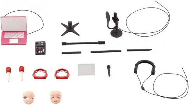 Small parts and accessories for figures Ritsuka, who aspires to become an idol, is now available with optional parts that are perfect for her! A microphone and karaoke terminal to recreate karaoke singing situations are included, as well as maracas, a tambourine and other items to liven things up! She also comes with headphones and other accessories that allow you to enjoy a realistic recording scene! The recording microphone can be used on either a tabletop type or a long stand! A notebook PC and mixer are also included, so you can enjoy the scenes as a distributor on the "Sosai Shoujo Channel," which is sure to be different from the After School scenes you've seen in the past! Ritsuka comes with two new expressions: an appealing face and a pouting face. Both a painted and unpainted version are included, so be sure to combine the two! Main Points of Attention Pre-painted expression parts Ritsuka Saeki comes with two newly sculpted and pre-painted facial expressions. The "appeal face" is based on an illustration of Ritsuka's birthday in 2021 by En Morikura. The "Pien Face" is a cute expression that can be used in situations where she has failed at something! Both an unpainted version and a water-transferable expression decal are included for those who prefer to have fun painting the face. She comes with three expressions - a front facing expression, a right facing expression and a left facing expression. A set of accessories for the karaoke scene is also included. A microphone, karaoke terminal, two types of maracas and two tambourines are included. The maracas and tambourine can be used behind the singer to liven up the scene. The karaoke terminal comes with decals to attach to the screen. Headphones. The ball joints at the base of the earpads allow you to adjust them to fit the character's head. A cable extends from the bottom of the earpads, making it a convenient accessory that can be used in a variety of situations. Microphone for recording A long type stand for standing recording and a tabletop stand can be used for a wide range of playback. The microphone comes with a cable that allows you to create more authentic situations. If you use the stand type, you can enjoy the situation as if you are trying your hand at "voice-over actor" work. Notebook PC/Mixer The "Notebook PC" comes with a cable. The "Mixer" has separate parts for the knobs and switches, so you can actually turn and slide them. The cables from the laptop, headphones, and microphone can be plugged into the small holes in the mixer. Decals can be attached to the laptop screen. Accessories (1) Appealing expression for Ritsuka Saeki (pre-painted type) x 1 (2) Appealing expression for Ritsuka Saeki (unpainted type) x 1 3)Saeki Ritsuka compatible expression: Pien face (pre-painted type) x 1 4)Ritsuka Saeki compatible expression: Pien face (unpainted type) x 1 5)Headphones x 1 set 6) Recording Microphone x 1 set 7] Microphone stand (long type) x 1 set 8)Microphone stand (table top type) x 1 9)Laptop PC x 1 set 10)Mixer x 1 set 11)Karaoke microphone x 1 12)Karaoke terminal x 1 13)Maracas x 2 14)Tambourine x 2 15)Cable x 2 *This cable is used for headphones/recording microphone/laptop/mixer. The specifications are to be cut off by yourself according to the required length. 16)Water transfer expression decal x 1 (17) Water transfer type decal for karaoke terminal/laptop PC x 1 (C) KOTOBUKIYA ----- Works Sosai Shoujo Teien Series Character Plastic Model Scale 1/10 Product Size Height: approx. 141mm Product Specifications Plastic model Number of Parts 1-50 Material PS, ABS, PVC (non-phthalate) Design Yunosuke Maruke The image is a prototype. It may differ slightly from the actual product. Also, it has been painted for the purpose of photography. (From Kotobukiya website)