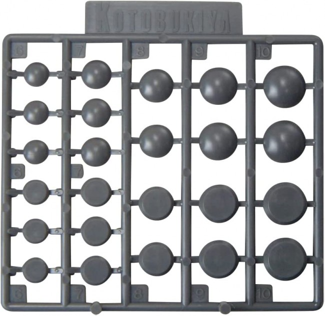 Detail Up Parts (SF) This set consists of 2 types (spherical and convex) x 3 sizes, suitable for the surface of 20cm class mechas and shield parts. The numbers on the runners indicate the diameter size (mm) of each. Works M.S.G Modeling Support Goods Series M.S.G Modeling Support Goods Product Specifications Plastic Model Number of Parts 1-50 (C) KOTOBUKIYA (From Kotobukiya website)