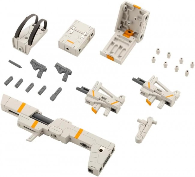 Detail Up Parts (SF) The concept is "Ready for any mission! Here comes the Tactical Container, which integrates four types of armament units in a single container! The four units include a handgun set, two transformable submachine guns, a tactical backpack, and a folding rocket launcher. Each unit can be used to recreate battle scenes at various distances and in various situations. Each unit can be freely connected to the other units, allowing the user to select the unit that best suits the mission. A dedicated flexible arm allows for free connection to the character. The tactical backpack and handgun case can be carried on the character's back like a school bag via the suspension unit with PVC belt. Product Specifications ■Two handguns are included. The suppressor stored in the gun case can be attached to the handgun. Various magazines can be removed from the case. Variable (transformable) submachine gun can be equipped with two submachine guns can be separated and transformed from the container form to the character. Rocket launcher can be transformed from container form to weapon form. Accessories Handgun × 2 ■ spare magazine × 4 Extension magazine × 1 Suppressor × 1 Gun case for handgun x 1 Variable submachine gun x2 Folding rocket launcher x1 Tactical backpack×1 Suspension unit with belt×1 Flexible arm x 1 (C) KOTOBUKIYA ----- Works M.S.G Modeling Support Goods Series M.S.G Modeling Support Goods Heavy Weapon Unit Scale NON Product Size Total length: approx. 120mm Product Specifications M.S.G Modeling Support Goods Material PS, PVC (non-phthalate) Designed by Masashi Watanabe Part number MH37 The image is a prototype. It may differ slightly from the actual product. It has been painted for the purpose of photography. (From Kotobukiya website)