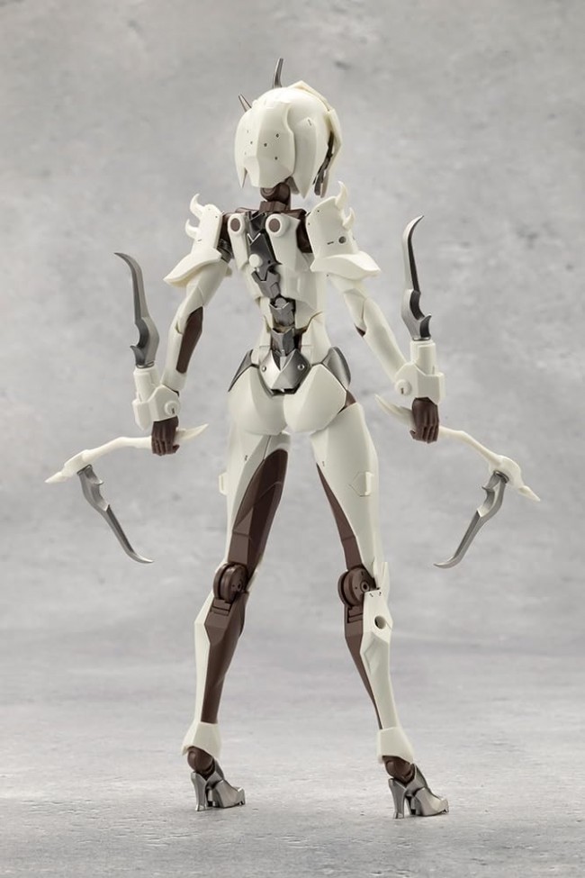 Plastic Sci-Fi/Animation Character Assembly Kit The fourth figure in the "Mugen KAIKOU Megalomaria" series is the Seeker, an adversary with a dubious atmosphere with a mix of off-white and silver artifacts that resemble bones. The Seeker is based on the motif of an assassin, and features hood-type headgear and a skull mask covering his bare face, designed with the intention of making him the first enemy to be treated as such. Like the Principal, the Seeker is a bare-bodied character and stands approximately 160mm tall with 50 points of articulation throughout his body. Unlike the three previous models, the chest is designed in such a way that the flesh has been removed and the sternum is exposed, allowing the figure to be treated as a neutral silhouette. The armor of each part is the same standard as the previous three models, so you can play with them interchangeably. Of course, it is also possible to customize the figure by attaching the "Metamorphose Unit: Ex Armor White Nurse" (sold separately). The figure is perfect for use as a one-to-many antagonist, as the character is truly a monster. Movable gimmick]. Approximately 50 points of her entire body are movable. The knee joints are single jointed and can be bent deeply to support a standing position. The knee armor is independently movable and can be adjusted to the desired position. Shoulders with multiple joints can be pulled forward and "crossed arms" are possible. The range of movement around the shoulders allows for a variety of poses, such as "flashy actions using the whole body" and "holding a sword with both hands". The torso also has an excellent range of motion, allowing you to pose her lying down freely. The neck is movable from front to back and left to right, allowing for poses where the head is turned away from the body. The elbows have a deep bend, allowing for feminine poses such as placing a hand on the cheek. The hip joints are independent of each other and can be moved to the front, allowing for poses like "flexibility exercises" and the legs can be opened wide to the left and right. The legs can be opened widely from side to side, allowing for a wide range of poses from "high kick" to "compact sitting pose". The buttock armor is also available in a "one-piece" version, so you can use it as you like. Triple Wrist Joint The wrist is bent almost 180 degrees inward to allow the hard point to rotate forward. Four "Hysteria Blades" are included, which can be rotated forward to resemble a praying mantis's sickle when mounted on the tip of the wrist armor. The arms can also be combined with optional weapon units to create a monster-like character with its own arms as weapons. By using the "normal wrist joint" and "spacer", you can enjoy the style of your choice. Sickle Two sickles are included as hand-held weapons. The blades are the same shape as the hysteria blades attached to the wrist armor and can be removed from the grip. Skull Mask] The skull mask can be detached from the hood, allowing you to enjoy the figure in two different forms: bare body and skull mask. Head and mask interchangeable. The hooded headgear has the same structure as the hair parts of the Sosai Shoujo Garden, so it can be interchanged with the hair parts of the Sosai Shoujo Garden. The headgear and mask parts are interchangeable. The Sosai Shoujo Garden "Ao Gennai" and "Kiko Kotobuki" are not interchangeable with Seeker because of their own standard. Accessories Seeker body x 1 Hysteria Blade x 4 Grip for Sickle x 2 Wrist parts x 7 Hip armor parts with 3mm hole for flying base x 1 Normal wrist joint & spacer x 1 Hip integrated armored parts x 1 What is TOKYO Mark? TOKYO Mark is a label that develops products incorporating Japanese domestic production technology. We will form a cooperative system with factories with various technologies scattered around Japan, consolidate them in Tokyo, where Kotobukiya's head office is located, and transmit them to the world, aiming to develop products that incorporate the label's specialties. (C) KOTOBUKIYA ----- Works Infinity Encounter Megalo Maria Series Character Plastic model Scale NON Product Size Total height: approx. 160mm Product Specifications Plastic model Number of Parts 51-200 Material PS, PE, ABS, POM, PVC (non-phthalate) Design Katsuhiko Hori, KOTOBUKIYA Part number CX006 The image is a prototype. It may differ slightly from the actual product. Also, it has been painted for the purpose of photography. (From Kotobukiya website)