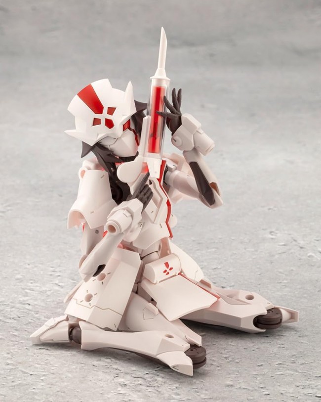 Plastic Sci-Fi/Animation Character Assembly Kit The second character in the "Mugen KAIKOU Megalo Maria" series, "Ruby Eye" is based on a nurse's costume. She is a DX item wearing the Metamorphose Unit, a rich set of options based on the motif of medical tools such as a syringe, scalpel, capsule and blood transfusion pack. As with the first "Principal" figure, the Metamorphosis Unit excels in a wide range of performances and action poses that are full of outward appearances. Each part of the skirt armor is connected with 3mm joints and can be freely movable according to the action pose. Partial interchangeability with the armor of "Principal" (sold separately) is also possible. Armed] The two scalpel-like swords "Scalpel" can be used as a double-edge mode by using the connecting parts. The injector attached to the hard point of her forearm can be removed and used as a hand-held weapon. Ex Armor White Nurse The skirt of the Ex-Armor she wears is made up of 3mm joints, and all six parts are movable. On the back of the figure is a "Life Blood Tank" which is based on a blood transfusion pack, and is beautifully finished with colorless clear and clear red molding. The included "Life Blood Capsule" is molded in clear red and clear colorless, and comes with 4 sets of capsules to attach to your favorite locations. Movable gimmick]. The body part is shared with the first "Principal" and 50 points of articulation are possible throughout the body. The knee joints are single jointed, but bend deeply and can also be used in a standing position. The knee armor is independently movable and can be adjusted to the desired position. Shoulders with multiple joints can be pulled forward and "crossed arms" are possible. The range of movement around the shoulders allows for a variety of poses, such as "flashy actions using the whole body" and "holding a sword with both hands". The torso also has an excellent range of motion, allowing you to pose her lying down freely. The neck is movable from front to back and left to right, allowing for poses where the head is turned away from the body. The elbows have a deep bend, allowing for feminine poses such as placing a hand on the cheek. The hip joints are independent of each other and can be moved to the front, allowing for poses like "flexibility exercises" and the legs can be opened wide to the left and right. The legs can be opened widely from side to side, allowing for a wide range of poses from "high kick" to "compact sitting pose". The buttock armor is also available in a "one-piece" version, so you can use it as you like. Triple Wrist Joint By bending the wrist almost 180 degrees inward, the hard point turns forward. By combining it with a weapon unit (sold separately), you can create a monster-like character whose arm itself becomes a weapon. The wrist joints and spacers can be used to create your favorite style. Wrist Joints There are a total of seven different wrist expressions. There are mainly a type designed to hold a sword, a type designed to hold a gun, as well as a hand sword and multiple flat hands. [Interchangeability of heads and masks The head has a layered structure, and each can be removed. The visor part has the same structure as Sosai Shoujo Garden's forelock parts, so they are interchangeable. The Ruby Eye mask parts are available in an "eye patch type" as well as a "both eyes open type". The mask parts are interchangeable with the facial expression parts of Sosai Shoujo Garden, and can be exchanged to create a character wearing a helmet or vice versa. *Compatibility of visor and mask parts. Sosai Shoujo Garden "Ao Gennai" and "Kiko Kotobuki" are not compatible with Ruby-Eye due to its own standard. Accessories Ruby Eye x 1 Mask (eye patch type) x 1 Mask (both eyes open type) x 1 Wrist parts x 7 Scalpel x 2 Connecting parts for Double Edge Mode x 1 Injector x 2 Lifeblood capsule x 4 Hip armor parts with 3mm hole for flying base x 1 Normal wrist joint & spacer x 1 Hip integrated armored part x 1 What is TOKYO Mark? TOKYO Mark is a label that develops products incorporating Japanese domestic production technology. We will form a cooperative system with factories with various technologies scattered around the country, consolidate them in Tokyo, where Kotobukiya's headquarters is located, and transmit them to the world, aiming to develop products that incorporate the label's specialties. (C) KOTOBUKIYA ----- Scale NON Product size: Approximately 160mm in height Product Specifications Plastic model Material PS, PE, ABS, POM, PVC (non-phthalate) Design Katsuhiko Hori, KOTOBUKIYA The image is a prototype. It may differ slightly from the actual product. Also, it has been painted for the purpose of photography. (From Kotobukiya website)
