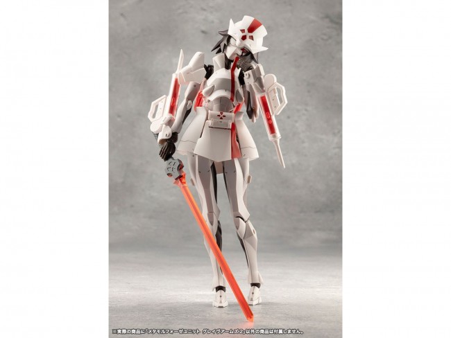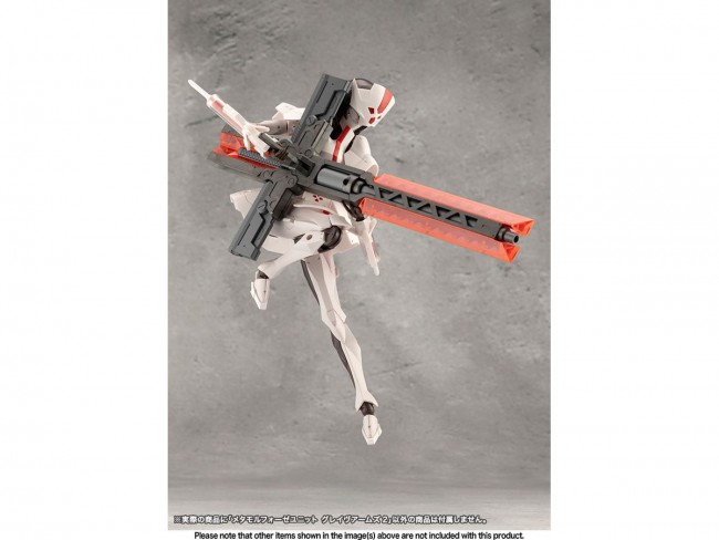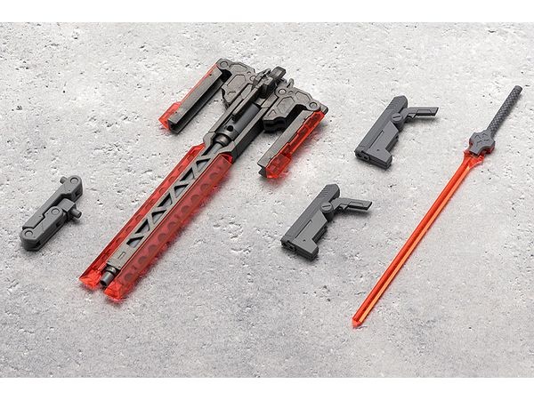 Detail-up parts (SF) This product is a color variation of the “GRAVE ARMS 2” that comes with the “GIRIE DO”. The “Grave Arms 2” is a huge cannon that resembles a crucifix, and it also has a huge sheath that holds a laser blade and two handguns inside. The sheath can also be transformed into a large sword mode by using a partial transformation gimmick, and by pulling out the grip and attaching the included effect parts, a special laser blade can be created to enhance the heroic action of the figure. A flexible mounting arm allows the figure to be mounted in a variety of locations. The handgun can be detached from the main body and used as two handguns. Molded in three colors: “Gun Metallic”, “Gray” and “Clear Red”. Accessories Grave Arms 2 × 1 Blade effect parts for laser blade x 1 (C) KOTOBUKIYA ----- Works Infinity Encounter Megalo Maria Series TOKYO Mark Character Plastic Model Scale NON Product size Length: approx. 155mm Product Specification Plastic model Number of Parts 51-200 Material PS Design KOTOBUKIYA Part No. CX009 The image is a prototype. It may differ slightly from the actual product. It has been painted for the purpose of photography. (From Kotobukiya website)