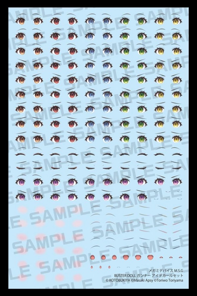 Water transfer/dry decals for sci-fi/anime character models The support series of the "Bishojo x Mechanic" series "Megami Device" is further expanded! The latest is "Megami Device M.S.G BUSTER DOLL Gunner Eye Decal Set"! Megami Device M.S.G" is a series of modeling support goods for Megami Devices. These decals are for BUSTER DOLL Gunner. The decals come with colors and expressions that are not printed on the Gunner's eye print, allowing you to enjoy a variety of Gunner's expressions by combining them. Of course, it can be used for other Megami device series than Gunner. This product is a decal set for Megami Devices. This product alone does not complete the main body. (C) KOTOBUKIYA (C) Masaki Apsy (C) Toriwo Toriyama ----- Works Megami Device M.S.G Series Character Plastic Model Product Specifications Options for Plastic Model Design Decal Data: Amema Part No. KP751 *The image is a prototype. It may differ slightly from the actual product. (From Kotobukiya website)