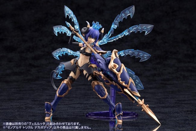 Detail-up parts (SF) From the new series “Xenoarma”, which further expands the world view and playability of the Arcanadia series, Trickle Decapodia” is now available as a plastic model! The model features a variety of gimmicks including recombination, clear parts inspired by the water attribute, and a curvy, fantasy-like design! From the new series “Xenoarma,” which further expands the world view and playability of the Arcadia series, “Trickle Decapodia” is now available as a plastic model. By reconfiguring the various parts, two different forms can be reproduced: “Monster Mode,” in which the product can be constructed and used as a stand-alone item, and “Weapon Mode,” in which it becomes a weapon or armor for the Dears. In particular, it is designed specifically for recombination with Verlutta, which also has the same water attribute, and can be connected to various parts of Verlutta. Furthermore, by combining with “Hydro Xephos”, it is possible to reproduce a large Xenoarma “Tidal Orkhetos”. Each part of the figure is designed with 3mm joints, allowing you to combine it with any of Kotobukiya's original series as well as Arcanadia's characters. Accessories and gimmicks The figure can be recreated in two different forms by reconfiguring the parts: “Monster Mode”, which can be used as a stand-alone product, and “Weapon Mode”, which can be used as Dears' weapon or armored. The “Tidal Orcateus”, a large Xenoarma, can be reproduced by combining it with the “Hydro Xephos”. The “Tidal Harpoon”, a large ranged weapon, can be reproduced by combining it with the “Hydro Xephos”. The 3mm diameter joints placed in each part allow for recombination by itself or in combination with existing “M.S.G”, “Frame Arms”, “Frame Arms Girl”, “Hexagear”, “Sosai Shoujo Teien”, “Megalomaria” series, and more. A common stand for Arcanadia is included. Trickle Decapodia” can be displayed floating. Weapon Mode Crown: 3mm joint can be connected to various Kotobukiya kits. Shoulder armor: 3mm joints can be connected to various Kotobukiya kits. Back Unit: 3mm joints at the base, ball joints, and axes at the end allow for flexible movement. Leg Armor: Knee and ankle armor are movable for mobility. Lance: Grip can be deployed for various poses. Three types of armor can be connected to various Kotobukiya kits with 3mm joints. *Some products may not be compatible due to shape restrictions. (C) KOTOBUKIYA ----- Works Arcanadia Series Character Plastic Model Scale NON Product size Height: 209mm Product Specifications Plastic model Number of Parts 51-200 Material ABS Sculptor Komatsu Makoto Part Number AS004 The image is a prototype. It may differ slightly from the actual product. It has been painted for the purpose of photography. (From Kotobukiya website)