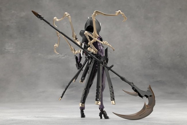 Plastic Sci-Fi/Animation Character Assembly Kit The boss villain “Necro Face” based on the motif of the Grim Reaper appears... Necro Face is a DX item equipped with [Curse Reaper (scythe)] and [Ex Armor Necromancer]. [Ex Armor Necromancer]. The hood-type headgear and the skull mask covering his bare face are removable. The mask on the body behind the skull mask has three eyes, and a third eye is sculpted on the forehead. The eyeballs are movable, and the gaze can be changed using the included jig and the scythe's stone butt. The mask parts can be interchanged with other female Megalomaria products (sold separately) and with facial expressions of other Sosai Shoujo Garden characters. The visor can be removed and replaced with hair parts of Sosai Shoujo Garden's characters. The hood can also be attached to the figure, but only for certain characters. The bangs can be attached to “Madoka Yuki”, “Koyu Koyomi”, “Eimi Nijimura”, “Emma Koishikawa”, and “Short Wig”. *The facial expressions and bangs are not compatible with those of Ao Gennai and Takekiko Kotobuki. The “Extended Prosthetic Limb” on the back can be turned into either a fully extended or retracted pose. The base of the prosthesis is 4mm ball-jointed, allowing you to create a 6-armed character by replacing the arms of the female Megalo Maria. The skirted armored parts are flexibly movable using ball joints and multiple movable axes, allowing for a wide range of action poses. The extended prosthetic limbs can be removed and played with as a “messenger” form. Curse Reaper. A large armament modeled after the scythe of the Grim Reaper. The blade part is clear molded and can be replaced to create the basic “Curse Reaper (scythe form)” or the “Magic Staff (staff form)”. The stone butt is molded in a + shape, and can be used for the movable eyeball gimmick of the Necro Face. Extended Skin Parts The “Extended Skin Parts,” which have received a great response since their release, are included to further enhance the combination with the Sosai Shoujo Teien and other Bishojo plastic model series. The skin color is white skin color C, which is a perfect match with the Sosai Shoujo Teien “Yakushiji Kyuon [Bonfire Maria Costume]”. Movable gimmick]. Approximately 50 points of her entire body are movable. The knee joints are single jointed, but can be bent deeply to support a standing position. The knee armor is independently movable and can be adjusted to the desired position. Shoulders with multiple joints can be pulled forward and “crossed arms” are possible. The range of movement around the shoulders allows for a variety of poses, such as “flashy actions using the whole body” and “holding a sword with both hands”. The torso also has an excellent range of motion, allowing you to pose her lying down freely. The neck is movable from front to back and left to right, allowing for poses where the head is turned away from the body. The elbows have a deep bend, allowing for feminine poses such as placing a hand on the cheek. Her hip joints are independent of each other and can be moved forward, allowing her to sit cross-legged on a chair and perform a wide range of poses, from a “high kick” to a “compact sitting pose”. The buttock armor is also available in a “one-piece” version, so you can use it as you like. Triple Wrist Joint By bending the wrist almost 180 degrees inward, the hard point turns forward. The “Hysteria Blade” included with the Seeker and Glyndor (sold separately) can be attached to the wrist armor. Accessories Necro Face x 1 Skull Mask x 1 Wrist parts × 7 kinds Curse Reaper (Scythe) x 1 Clear parts for Magic Staff x 1 Normal wrist joint & spacer x 1 Armored parts for integrated buttocks x 1 Extended skin parts Color C Ver. x 1 set (C) KOTOBUKIYA ----- Works Infinity Encounter Megalo Maria Series TOKYO Mark Character Plastic Model Scale NON Product size Height: approx. 170mm Product Specifications Plastic model Number of Parts 201-400 Material PS, PE, ABS, POM, PVC (non-phthalate) Design Katsuhiko Hori, KOTOBUKIYA Part number CX016 *The image is a prototype. It may differ slightly from the actual product. Also, it has been painted for the purpose of photography. (From Kotobukiya website)