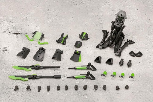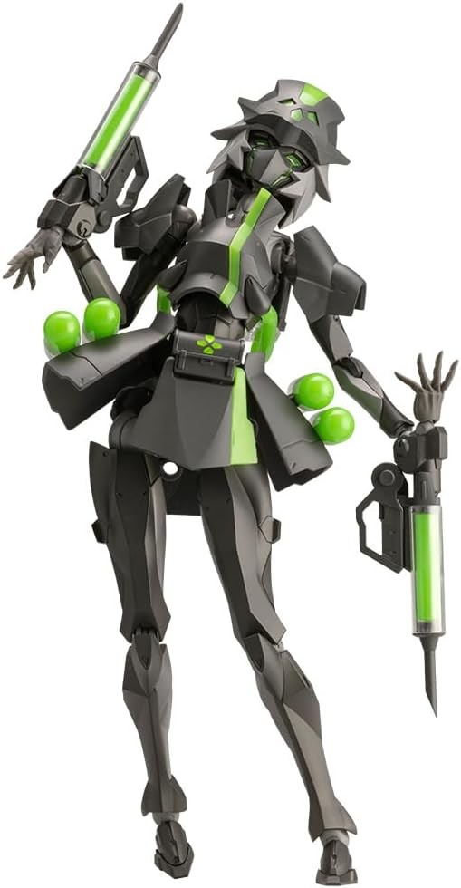Plastic Sci-Fi/Animation Character Assembly Kit Image change from white nurse to black nurse. Dark-colored ruby eyes “Peridot” is a color variation kit that changed the molding color of the ruby eyes. Two accent colors, “Lime Green (translucent)” and “Bubblegum Pink (translucent)” are included to make [Black x Lime Green] “Peridot” or [Black x Bubblegum Pink] “Ruby Eye Creep Poison” by choice. [Ex Armor Black Nurse/Sculpture/Injector Comes with two psychedelic accent color parts that contrast beautifully with the black. Can be assembled in the color of your choice. The included “Energy Seed” is molded in accent color and colorless clear and can be assembled in 4 sets. The skirt is made up of 3mm joints and has a total of 6 points of articulation. The two “Scalpel” swords can be used in double-edge mode by using the connecting parts. The injector attached to the hard point of the forearm can be removed and used as a hand-held weapon. Movable gimmick]. The body part is shared with the first “Principal” and approximately 50 points of articulation are possible throughout the body. The knee joints are single jointed, but bend deeply and can be used in a standing position. The knee armor is independently movable and can be adjusted to the desired position. Shoulders with multiple joints can be pulled forward and “crossed arms” are possible. The range of movement around the shoulders allows for a variety of poses, such as “flashy actions using the whole body” and “holding a sword with both hands”. The torso also has an excellent range of motion, allowing you to pose her lying down freely. The neck is movable from front to back and left to right, allowing for poses where the head is turned away from the body. The elbows have a deep bend, allowing for feminine poses such as placing a hand on the cheek. The hip joints are independent of each other and can be moved to the front, allowing for poses such as “flexibility exercises” and the legs can be opened wide to the left and right. The legs can be opened widely from side to side, allowing for a wide range of poses from a “high kick” to a “compact sitting pose”. The buttock armor is also available in a “one-piece” version, so you can use it as you like. Triple Wrist Joint By bending the wrist almost 180 degrees inward, the hard point turns forward. By combining it with a weapon unit (sold separately), you can create a monster-like character whose arm itself becomes a weapon. The wrist joints and spacers can be used to create your favorite style. Wrist Joints There are a total of seven different wrist expressions. There are mainly a type designed to hold a sword, a type designed to hold a gun, as well as a hand sword and multiple flat hands. [Interchangeability of heads and masks The head has a layered structure, and each can be removed. The visor part has the same structure as the forelock part of the Sosai Shoujo Garden and is therefore interchangeable. Peridot's mask parts are also available in “eye patch type” as well as “both eyes open type”. The mask parts are interchangeable with Sosai Shoujo Garden's facial expression parts, and can be exchanged to create a character wearing a helmet or vice versa. *Compatibility of visor and mask parts. Sosai Shoujo Garden “Ao Gennai” and “Takekiko Kotobuki” are not compatible with Peridot due to their own standard. Accessories Peridot body x 1 Accent color parts “Lime green (translucent)” x 1 Bubblegum pink (translucent) accent color × 1 Mask (both eyes open type) x 1 Mask (eye patch type) x 1 Wrist parts x 7 Scalpel x 2 Connecting parts for Double Edge Mode x 1 Injector x 2 Energizer x 4 Hip armor parts with 3mm hole for flying base x 1 Normal wrist joint & spacer x 1 Hip integrated armor parts x 1 (C) KOTOBUKIYA ----- Works Infinity Encounter Megalo Maria Series TOKYO Mark Character Plastic Model Scale NON Product size Height: approx. 160mm Product Specifications Plastic model Number of Parts 201-400 Material PS, PE, ABS, POM, PVC (non-phthalate) Sculptor Katsuhiko Hori, KOTOBUKIYA Part No. CX023 The image is a prototype. It may differ slightly from the actual product. Also, it has been painted for the purpose of photography. (From Kotobukiya website)