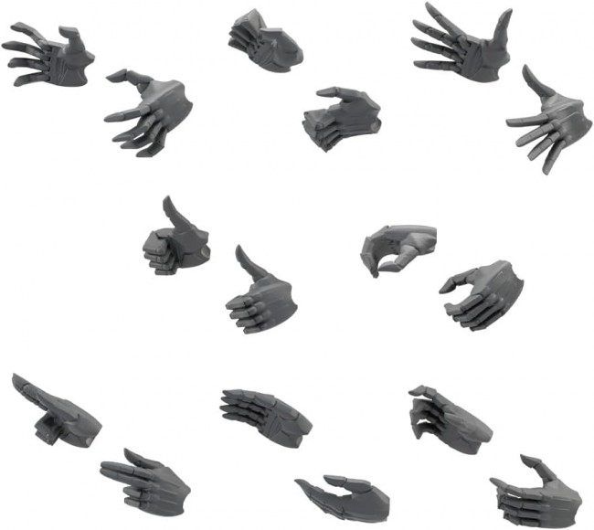 Detail-enhancing parts (SF) Introducing an expressive hand unit for male characters that greatly enhances marionette-style performance! *The molded color is black to match zirconia and gilidou. This product is not a TOKYO Mark brand product. [Hold] This expression is for holding thick objects such as pipes that are about 5 mm in diameter. It is sure to be useful in various scenes, such as holding the arms or ankles of enemy characters to perform techniques. 【Stance】 This expression is essential for powerful, open poses reminiscent of a fighter's stance. It also allows for actions like grabbing an opponent's face or building up power. 【Palm Strike】 Recommended for striking poses that differ from punches. It's also ideal for unleashing a finishing move after building up power. 【Open Hand】 This expression, which hugs the ground tightly, allows for poses such as “summoning” something, “wall-slamming,” or even handstands. 【Thumbs Up】 Recommended for passionate hero-like gestures. 【Seal】 Recommended for ninja characters or onmy?ji! A strong character-driven expression. 【Supporting Hand】 This pose shines in quiet poses, such as lifting something or gently touching someone's face. Recommended for interacting with the S?sai Girls. 【Grasp】 Recommended for actions that involve grasping something without fully clenching the fist. Useful for scenes where the character grasps something thicker than a weapon handle, such as an arm. 【Accessories】 ・8 types of wrist parts × 1 each for left and right “Hold,” “Stance,” “Palm Down,” “Open Hand,” “Thumbs Up,” “Seal,” “Supporting Hand,” “Grasping” (C) KOTOBUKIYA ----- Work Mugen Kaikou Megalomaria Series Character Plastic Model Scale NON Product Size Total Length: Approximately 20mm (Open Hand) Product Specifications Plastic Model Number of Parts 1?50 Material PVC (Phthalate-Free) Design BRAIN Product Number CX027 *The image is a prototype. The actual product may differ slightly. (From the Kotobukiya website)