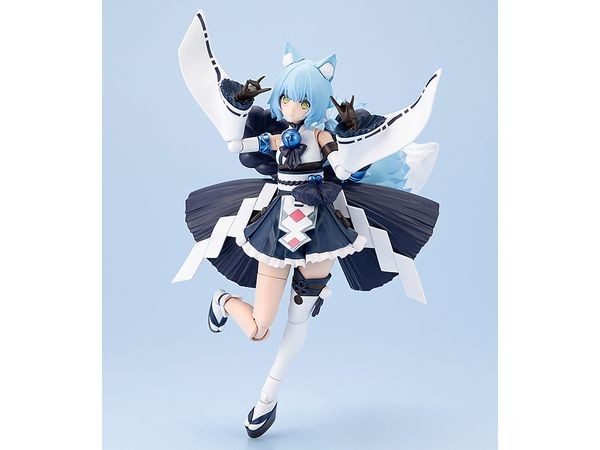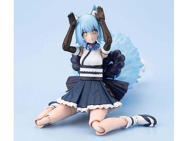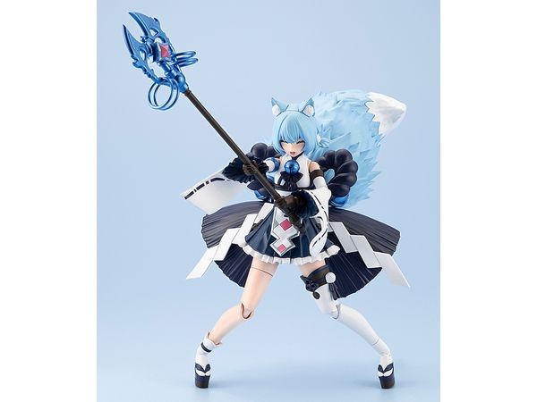 Plastic Assembled Figure Kit The third in the “ReACT” series of styles by changing attributes! From the “Arcadia” series comes a plastic model of the beast-like Dears “Yukumo” as a water attribute version “Yukumo ReACT-C” with an image of snow. Four new facial expressions are included to give the figure a different character from Yukumo. By reconfiguring the parts dedicated to each part, two different forms can be reproduced with a single product: the non-combat state “Normal Mode” and the combat state “Wraith Mode. Each part is designed with 3mm joints, and can be combined with other Kotobukiya original series. Accessories & Gimmicks Two different modes can be reproduced by reconfiguring the parts dedicated to each part: a non-combat state [Normal Mode] and a combat state [Wraith Mode]. She comes with four pre-printed facial expressions: a downcast expression, a crying expression, a shouting expression, and a sparkling expression. Water-transferable expression decals are included to create your favorite facial expressions. Both side knots of hair are independently movable with ball joint connection. A ring part (collar) is included to engage Yukumo. The magic circle shaped parts on her back are hexagram joints with a 3mm hole in the center, and are compatible with the magic circle shaped parts from the Arcanadia series. The rope parts extending to both sides of the back have a shaft connection at the base, allowing the angle of the rope to be changed. The bell and paper hanging parts connected to the shimenawa are movable with ball joints. Normal mode leg joints have a pull-out type knee joint, allowing for both a beautiful leg line and a wide range of movement. A special tin cane-shaped weapon is included. All parts of the tin cane's rings are independently movable. A sword-shaped weapon is included. The skirt on the front side of the waist is made up of independent parts, allowing the figure to move without alienating the character's movements. The large tail extending from the waist can be moved up, down, left and right in accordance with the character's movements by connecting the base of the tail to the shaft. The tail has a three-layered structure, each of which is flexibly movable via a ball joint connection. The tip of the tail in normal mode can be flexibly moved up, down, left, right by connecting the axis. Dedicated stand included. Dedicated joint for connecting the lower part of the tail is included. Dedicated stand and joint ensure holding power. Dedicated wrist joints for holding weapons are included. Six PVC wrist joints are included for each side. Can hold existing M.S.G, Frame Arms, and Frame Arms Girl series armaments. The 3mm diameter holes placed on each part allow for use with existing M.S.G, Frame Arms, and Frame Arms Girl series armaments. A neck part is included to connect the heads of Frame Arms Girl and Megami Device. (C) KOTOBUKIYA ----- Works Arcanadia Series Character Plastic Model Scale NON Product Size Total height: approx. 155mm Product Specifications Plastic Model Number of Parts 201-400 Material PS, ABS, POM, PVC (non-phthalate) Design Tatsuya Ishii, maimi Part number AR023 The image is a prototype. It may differ slightly from the actual product. It has been painted for the purpose of photography. (From Kotobukiya website)