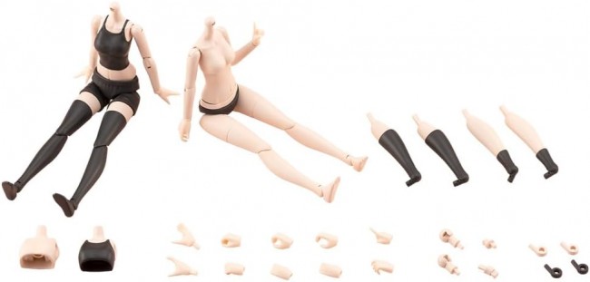 Figure Accessories and Parts A new color variation of the Dress Up Body [S] is now available! The color of the outfit has been changed from white to black, and the skin color has been changed to fair skin color C. Enjoy dressing it up in various outfits! The set includes two types of outfits, “relaxed wear” and “inner wear,” and you can choose from two bust sizes, “slender type” and “regular type.” The simple yet highly movable structure makes it ideal as a base for customization. ▼Key Features 【Two Body Types】 This product includes two types of base bodies. ※The head from the S?sai Sh?jo Teien series is not included. The design is intended to achieve a total height of approximately 140mm when using the S?sai Sh?jo Teien head. The Relax Wear features a short camisole and shorts, designed for a relaxed, at-home vibe. The Inner Wear type is compatible with various doll clothes designed for 14cm models, such as the Tiny Closet (Kotobukiya exclusive) sold separately. Its smaller frame compared to M size allows for a wider range of clothing options. 【Two types of bust sizes】 We have prepared two types: the “slender type” matched to the image of “Kojimachi Emma” and the “regular type” for general use. Both “relaxed wear” and “inner wear” are available in both types. Please use them according to the image you want to create. 【3 Types of Neck Joint Lengths】 Three types are included: “A Type (compatible with S?sai Sh?jo Teien),” “B Type (compatible with Megami Device),” and “C Type (compatible with doll clothing).” The B Type is slightly longer than the A Type to accommodate the head of Megami Device. The C Type is even longer than the B Type and is used to prevent the neck from being covered by the collar of doll clothing. Additionally, two types of neck ball joint diameters are included: “5mm Type” and “6mm Type.” The 5mm Type is compatible with “S?sai Sh?jo Teien,” “Arcanadia,” “Frame Arms Girl,” and “Mugen Kaik? Megalomaria,” while the 6mm Type is compatible with “Megami Device.” 【Neck Slide Joint】 The neck joint adopts the same type as used in Kotori Reki [Swimsuit], featuring a sliding mechanism that allows movement forward and backward, enhancing the ability to move the head up and down, such as “tilting the chin” or “looking up,” and can also be used to avoid interference with hair movement. 【Selectable Sock Types】 Sock types can be selected from “short socks,” “high socks,” and “over-the-knee socks,” with the entire lower leg being replaceable. ※The thighs used with the short sock and high sock types are shared with the barefoot type. 【Body Color】 The body color is Skin Color C, “YOMI [Black Canvas]” “Kojimachi Emma [Seiirisu Girls' Academy High School Summer Uniform] Dreaming Style Wonderland Princess” “Kojimachi Emma [Seiirisu Girls' Academy High School Winter Uniform] Dreaming Style Imperial Rose” “Saeki Ritsuka [Swimsuit] Hair Arrangement Ver.” “Nijimura Eimi [Reihou High School Summer Uniform] Dreaming Style Romantic Memories” “Yakushiji Kuon [Kagari Marika Costume]” “Yakushiji Kuon [Momo Sakura High School Uniform]” and others. ▼Accessories 1) Relaxed Wear Type Torso ×1 2) Inner Wear Type Torso ×1 3) Bust Part (Slim Type) for Relaxed Wear ×1 4) Bust Part (Slim Type) for Inner Wear ×1 5) Bust Part (Regular Type) for Relaxed Wear ×1 6) Bust Part (Regular Type) for Inner Wear ×1 7) Short Socks Leg Parts × Left and Right 8) High Socks Leg Parts × Left and Right 9) Over-the-Knee Socks Leg Parts × Left and Right 10) Bare Feet Parts × Left and Right 11) Wrist Parts 7 Types “Grasping Hand (Standard)”, “Grasping Hand (Narrow)”, “Grasping Hand (Wide)”, “Grasping Hand (Round)”, “Gripping Hand”, “Pointing Hand”, “Flat Hand” × Each Left and Right (Since only one set of wrist parts is included, the same wrist parts cannot be used for both Relax Wear and Inner Wear types.) 12) Neck Joint A Type (Relax Wear) ×1 13) Neck Joint A Type (Inner Wear) ×1 14) Neck Joint B Type (Relax Wear) ×1 15) Neck Joint B Type (Inner Wear) ×1 16) Neck Joint C Type (for Relax Wear) ×1 17) Neck Joint C Type (for Inner Wear) ×1 18) Neck Ball Joint 5mm Type ×2 19) Neck Ball Joint 6mm Type ×2 20) Optional Ankle Joint [Skin Color C] × Left and Right (Compatible with the sandals and ankles included with Saeki Ritsuka [Swimsuit] Hair Arrangement Ver.) 21) Optional Ankle Joint [Black] × Left and Right (Compatible with the ankles and shoes of Kobayashi Emma [Uniform].) (C) KOTOBUKIYA