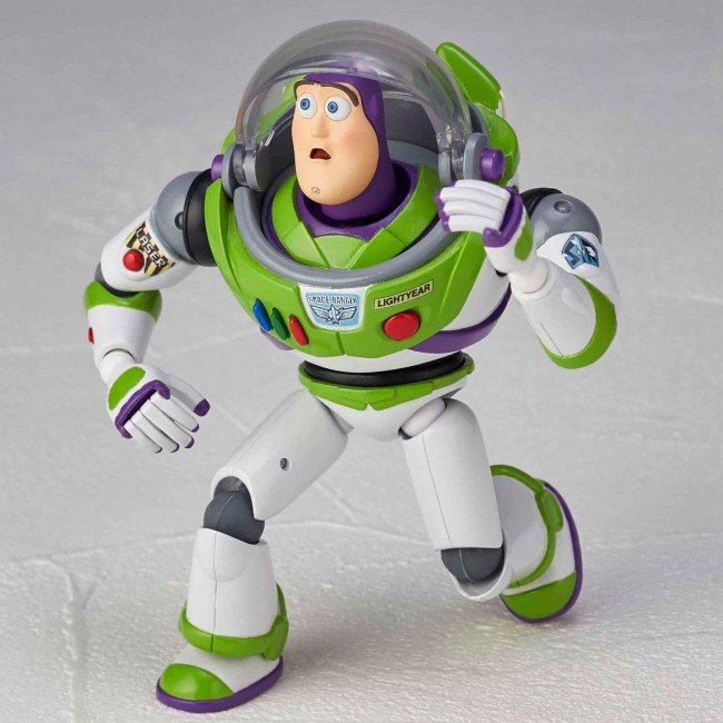 Revoltech Series. Buzz Lightyear, the galaxy-spanning space ranger, is back! Buzz Lightyear from Kaiyodo's popular Toy Story action figure series is back again! The figure comes with a total of 5 different facial expressions. The first half of the face can be detached and replaced with a different expression. The eyes can be freely moved from the back side of the figure, and can be moved around to create the rich expressions seen in the movie. The Little Green Men's three eyes can be freely changed from the back side, and can be placed alongside Buzz's to create a comical scene from the movie. The transparent canopy on the head can be opened and closed to recreate the gimmick of the toy in the movie, allowing you to recreate a variety of situations. Wing parts are also included, allowing you to recreate flight poses. The base of the fingers are movable. The thumb can move independently, allowing for a wide range of poses. Three types of Green Army Men are also included. Material Figure material: PVC, ABS, POM Blister: PET Outer box: paper Accessories Optional face×4 Wing parts x 2 Little Green Men×1 Green Army Men x 3 Display stand x 1 Buzz Lightyear ver.1.5: Product Series] Revoltech Size] Approximately 125mm in height Sculptor] Matsumoto Eiichiro (C) Disney/Pixar