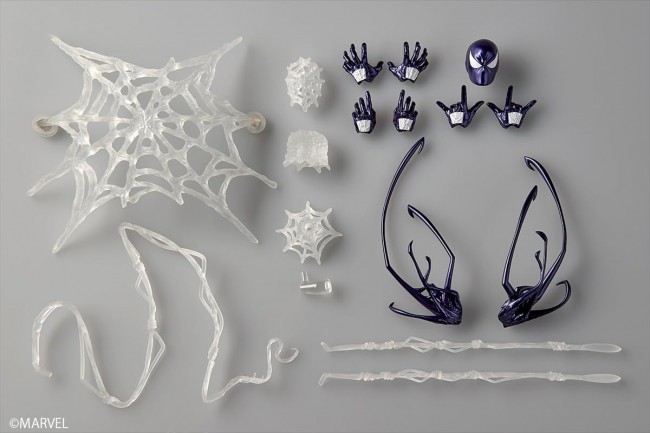 Revoltech Series. Impactful! The Purple Suit Symbiote Spider-Man arrives! A new suit granting Spider-Man immense power. The Symbiote Suit Spider-Man, origin of many derivative characters, now appears in comic-style purple! Retaining the classic silhouette with organic details, the full-body coloring is refreshed in purple. This stylish yet unsettling color, inspired by American comic book illustrations, brings out a different kind of charm. Web effect parts include the basic firing state, plus variations designed for playability with other figures: a magnet-equipped net to pin opponents to walls, and a solidified web that covers and restrains both hands. Express the suit's danger with a ferocious angry face and the Symbiote effect attachable to the back! 【Revoltech Amazing Yamaguchi Symbiote Spider-Man (Purple Ver.)】 ■Series Name Revoltech ■Prototype Sculptor Katsuhisa Yamaguchi ■Product Code NR106 ■Size Approx. 160mm (5.1in) tall ■Materials PVC, ABS, POM, Magnets ■Accessories ・Optional Hands x 6 ・Optional Face x 1 ・Symbiote x 2 ・Wall-Clinging Web x 1 ・Web x 3 ・Web Tip Part x 1 ・Wrist-Clinging Web x 1 ・Adhesive Web x 1 ・Display Stand x 1 *The number (types) of optional parts does not include those attached at the time of shipment (standard). (C)MARVEL