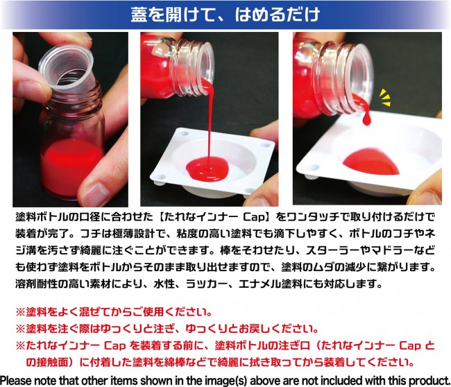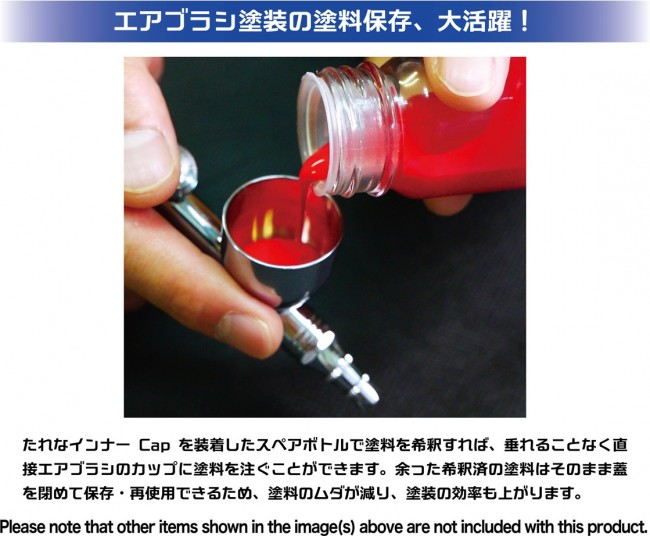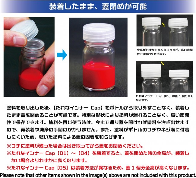 For modeling/modeling aids, etc. When removing paint from a paint bottle, paint can adhere to the edge of the bottle or screw groove, causing hassle in wiping off and wastage of paint, which can also cause the lid to stick. The Tareuna Inner Cap is a special inner cap that is attached to the paint bottle to pour paint without dripping and to make it easier to remove paint from the bottle. After use, the cap can be stored with the bottle lid closed. The lineup includes five different shapes, making it compatible with a wide range of model paint bottles. Features. Simply open the lid and insert the cap. Just one-touch installation of the Tareuna Inner Cap, which matches the diameter of the paint bottle, is all that is required to complete the installation. The ultra-thin cap design allows even highly viscous paints to drip easily and pour cleanly without contaminating the bottle edge or screw groove. Paint can be removed directly from the bottle without the use of a stirrer, muddler, or other tools, reducing paint wastage. The solvent-resistant material makes it compatible with water-based, lacquer, and enamel paints. *Please mix the paint well before use. When pouring paint, pour slowly and return slowly. Before attaching the Tareuna Inner Cap, wipe off any paint on the paint bottle spout (the surface in contact with the Tareuna Inner Cap) with a cotton swab or similar tool. The cap can be closed with the cap in place! After removing paint, the lid can be closed without removing the Tareuna Inner Cap from the bottle. The special shape of the cap prevents paint from leaking and keeps the bottle tightly sealed. When it is time to use the paint again, simply open the lid and pour out the paint as before, eliminating the need to reattach and clean the bottle. In addition, paint is less likely to adhere to the bottle's edge or threaded groove, thus relieving sticking of the lid due to dried paint. *If paint remains on the edge, wipe it off before closing the lid. When the Tareuna Inner Caps [01] - [04] are attached, the overall height of the lid when closed will be slightly higher than when the lid is not attached. The height of the Tareuna Inner Cap [05] is slightly higher than that of the lid without it. Great for storing airbrush paint! By diluting paint with an empty spare bottle fitted with the Tareuna Inner Cap, paint can be poured directly into the airbrush cup without dripping. The spare bottle can be closed to save and reuse the leftover diluted paint, reducing paint waste and improving painting efficiency. Compatible with various model paints! Five types of bottles are available to accommodate a variety of common model paints. Tare-nai Inner Cap [01] (for T Company 10ml square bottles) Tangling Inner Cap [02] (for T Company 10ml cylindrical bottles) Tangy Inner Cap [03] (for Company C 10ml Cylindrical Bottle) Tare Inner Cap [04] (for Company G's 15ml Cylindrical Bottle) (this product) Tare Inner Cap [05] (for Company G's 50ml cylindrical bottle) Tare-na Inner Cap [04] is only compatible with lids with an integrated stopper. Tare-na Inner Cap [05] can be used with both lids with an integrated stopper and lids with a separate stopper. When using a lid with a separate inner cap, be sure to close the lid after fastening the inner cap. The G 10ml cylindrical bottle, 30ml cylindrical bottle, and paint bottles that do not have an integrated lid and stopper are not compatible with this product. Product Specifications ◆Size Tareuna Inner Cap [04]: approx. φ25 x H15mm ◆Set Contents Tare-na Inner Cap [04]: 6 pieces (for Company G's 15ml cylindrical bottle) Precautions This product does not completely prevent dripping. Dripping may occur depending on the condition of the paint and the pouring method. Please mix the paint well before use. This product is for model paints only. Do not use as a solvent spout. (Do not use this product as a solvent spout, as it may cause leakage or dripping.) The lid will be shallow when closed due to the product's specifications. If the lid is closed too tightly, the product may deform, causing the lid to leak or come off. If the lid is closed with the edge of the product still dirty, it may be difficult to open. If the paint remains on the edge of the bottle, wipe it off with a cotton swab to remove any residue. Please be sure to store the paint bottle upright to prevent leakage. Depending on the type of paint, the color of the paint may migrate to this product. When reusing the same color paint bottle, be sure to use a new paint bottle for each paint. When reusing the product, attach it to a paint bottle of the same color. To maintain the tight seal, wipe off any paint remaining on the spout after use and close the lid. Please note that the product may not be attached properly depending on the individual differences or combination of the product and the bottle. Please follow the paint manufacturer's instructions for handling paint. If you experience any problems when using this product, please contact the Plastic Model Improvement Committee Customer Support.