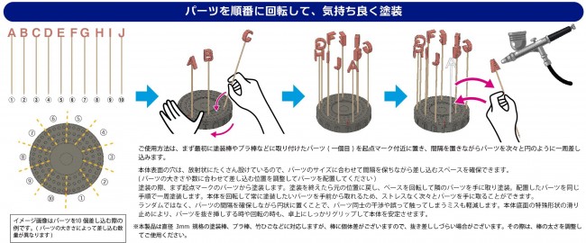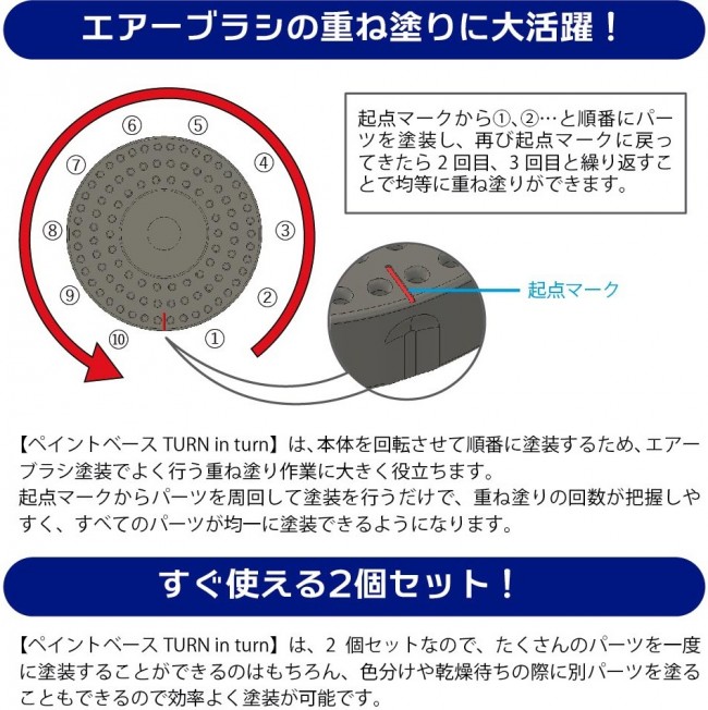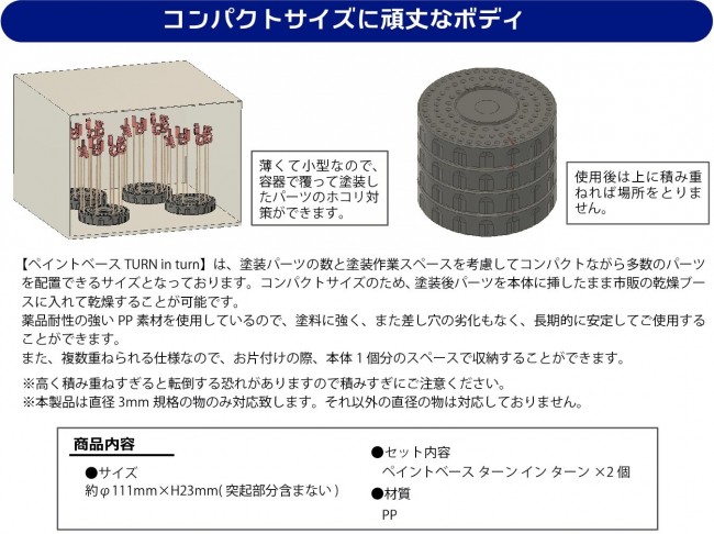Modeling/modeling aids, etc. Paint the parts in order. When painting with an airbrush or sprayer, a paint stand is useful for drying and layering parts mounted on a paint stick, etc. However, the more parts there are, the denser the parts become and the harder it is to remove them, or they may come into contact with each other and the paint may peel off. Also, it is difficult to know how many coats to apply to each part when layering, so the paint may not be applied evenly, resulting in unevenness. Paint Base TURN in turn is a rotating paint base that allows you to easily organize parts while drying and applying layers of paint efficiently. The surface of the base has many holes so that paint sticks and other tools can be placed according to the size of the parts. Once the parts to be painted are arranged in a circular pattern in good order, simply rotate the main unit and the parts to be painted can be immediately picked up without touching each other. Also, by inserting the painted parts and rotating them in order, it is easy to see how many coats are needed and to paint the parts evenly. The compact size of this product makes it possible to dry the painted parts in a drying booth while standing them up, or to stack them after use and store them in a space-saving manner. This product can be used with paint rods, plastic rods, and bamboo strips with a diameter of 3 mm. [Rotate the parts in order and paint pleasantly.] To use, first place the first part attached to the painting stick or plastic rod near the starting point mark, and then insert the parts one after the other in a circular motion while spacing them out. Since many holes on the surface of the main body are provided in a radial pattern, you can secure the space to insert the parts while maintaining spacing according to the size of the parts. (Please adjust the position of insertion according to the size and number of parts and place the parts accordingly.) When painting, paint from the parts of the starting point mark first. After painting is complete, return the base to its original position, rotate the base, pick up the adjacent parts, and paint them. Paint the positioned parts in the same procedure all around. Since you can always take the part you want to paint from the front by rotating the unit, you can pick up parts one after another without stress. By placing the parts in a circular pattern, ensuring the spacing between parts rather than randomly, interference between parts and mistakes caused by accidental touching are reduced. The specially shaped non-slip surface on the bottom of the main body provides a firm grip on the tabletop to stabilize the main body when inserting and removing parts and when rotating. This product is compatible with painted rods, plastic rods, bamboo strips, etc. with a diameter of 3 mm, but there are individual differences in rods, so it may be difficult to insert and remove. In such cases, please adjust the thickness of the stick. [Great for layering airbrush paint!] Paint Base TURN in turn] is very useful for airbrush painting because you can paint in turn by rotating the main body. Simply painting by circling the parts from the starting point mark makes it easy to keep track of the number of overlapping coats and ensures that all parts are painted evenly. [Compact size and sturdy body] Paint Base TURN in turn] is compact yet large enough to accommodate a large number of parts in consideration of the number of parts to be painted and the painting work space. Due to its compact size, it is possible to dry the painted parts in a commercially available drying booth with the parts inserted in the body after painting. The PP material is highly resistant to chemicals, so it is resistant to paint and the insert holes do not deteriorate, ensuring stable use over a long period of time. The multiple stackable design allows for storage in a space equivalent to that of a single unit when cleaning up. This product is only compatible with 3mm diameter standard. Other diameters are not compatible. [Set of 2 ready-to-use!] Paint Base TURN in turn] is a set of 2 pieces, so you can paint many parts at once, or paint other parts while waiting for color separation and drying. Set includes Paint base TURN in turn x 2 Size: approx. Approx. φ111mm x H23mm (excluding protruding parts) Material: PP PP