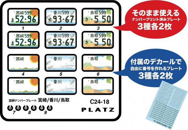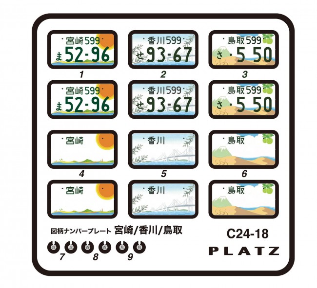 Detail Up Parts for Car & Motorcycle Models Want to finish your 1/24 car models with your favorite numbers! This etching parts set reproduces license plates that can be used for 1/24 car models. Colorful illustrations are drawn on the license plate, or characters are drawn to reproduce popular local design license plates. These parts are noteworthy for car modelers to produce an original finish to the car models they have built. The sharply finished etched parts reproduce Japanese automobile license plates and license plates. The set includes pre-printed etching parts for the license plate number and etching parts with only the base illustration printed on them, which you can choose and finish by yourself. The set also includes decals for those who choose their own license plate numbers. This set includes a total of three models of the design license plates issued in Miyazaki, Kagawa, and Tottori prefectures. The design license plate issued in Miyazaki Prefecture has been called Hyuga (日向) since mythical times. The catchphrase, "Miyazaki Prefecture, the Hinata of Japan," which is derived from the word Hyuga, which is also read as Hinata, is used in the design of the license plates. The design license plate issued in Kagawa Prefecture in Shikoku depicts Kagawa's famous olives and the Seto Ohashi Bridge. In addition, the design license plate issued in Tottori Prefecture depicts the well-known Tottori Sand Dunes, Mt. The set comes in two types: one with the illustrations and numbers pre-printed and ready to use, and one with the base painted and the numbers selected from the included decals to affix. There are 12 plates, and the number decals are high quality decals that are easy to apply. This is a set that car modelers are sure to enjoy using to add an original finishing touch to their creations! Reproduction of 1/24th scale license plates. Includes three types: Miyazaki, Kagawa, and Tottori. Plates are sharply reproduced with etched parts. Set of 12 plates (4 plates of each of the 3 types of plates) Plates are available in two types: pre-printed and usable as-is up to the number, or you can put your favorite number using the decals that come with the plate. The release date, price, product name, etc. are subject to change without notice. Please understand that the release date, price, product name, etc. are subject to change without notice.