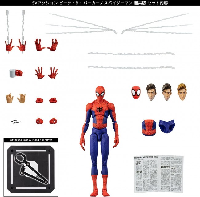 Set includes: body, Spider-Man head, Peter B. Parker head (expression 1), Peter B. Parker head (expression 2), Peter Parker head, replacement parts for Peter Parker (abdomen and groin area), glasses, newspaper, bare hands (left and right), hand parts A (left and right), hand parts B ( Hand Parts C (left and right), Hand Parts D (left and right), Wrist holding mug (right), Wrist with effects (left and right), Effect Parts A×2, Effect Parts B×2, Pedestal