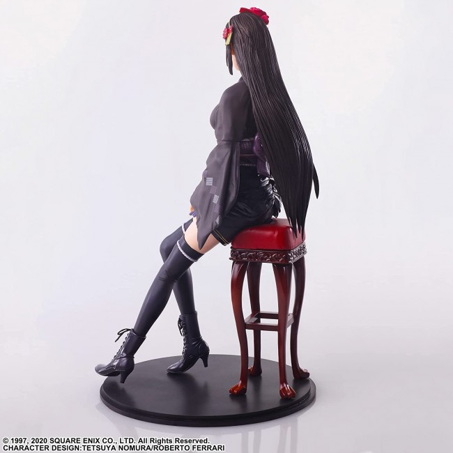 [Size] Approx. W136mm x D141mm x H239mm (including chair and base) From "FINAL FANTASY VII REMAKE", Tifa wearing an exotic dress has appeared in Static Arts! She wears a flower ornament in her hair and a gorgeous obi sash, representing a major image change from her usual appearance. She is sculpted sitting shallowly on a chair with her hands on her knees. The loose sleeves of her dress and her well-proportioned body line are also a highlight of this figure, which is only possible with Static Arts.