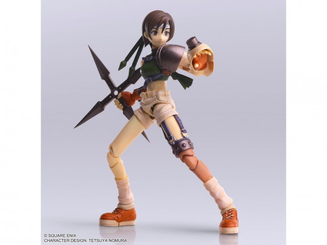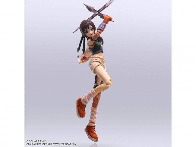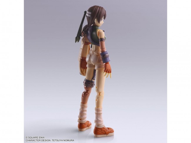 From "FINAL FANTASY VII," Yuffie Kisaragi appears in BRING ARTS! Based on the original FINAL FANTASY VII, the figure's large eyes, vivacious expression, characteristic potholders and left shoulder protector, and active-looking outfit all contribute to a nostalgic appearance that could be called Yuffie's origin story. The figure comes with Yuffie's symbolic weapon, a large shuriken, a closed-mouth smile, and various interchangeable hands, allowing for a variety of scenes to be recreated. FINAL FANTASY VII Bring Arts Yuffie Kisaragi: Number of posable parts: 27 Size: approx. W48.5mm x D31mm x H130mm Weight: approx. 39g (C) SQUARE ENIX  CHARACTER DESIGN: TETSUYA NOMURA The photo is a work in progress. Please note that the actual product may differ.