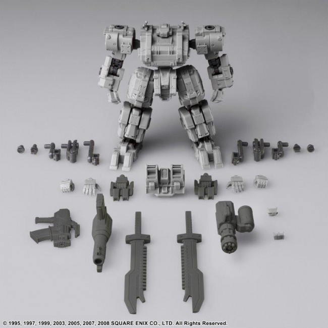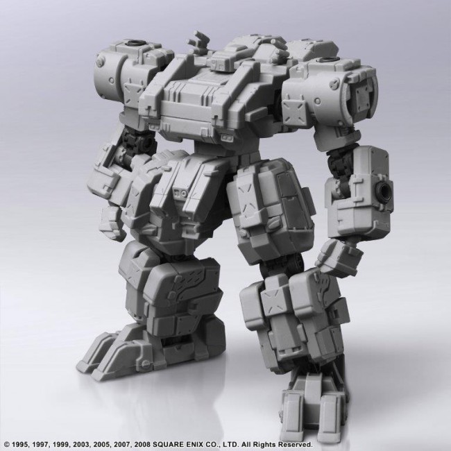 Vol.1, Vol.2 and Vol.3 of FRONT MISSION STRUCTURE ARTS are re-released with new molding color (light gray). FRONT MISSION STRUCTURE ARTS are designed in 1/72 Scale and can be adapted for diorama display with military miniatures of the same Scale. The interchangeability of the torso, arms, lower body, backpack, and hand-held armament is of course reproduced, and a total of four hard points on the shoulders and lower arms allow for shoulder armament, shields, and other equipment. Product size: Approx. W 70mm x D 52mm x H 81mm Weight: 66g Total number of parts: 134 (C) 1995, 1997, 1999, 2003, 2005, 2007, 2008 SQUARE ENIX CO. The photo is a work in progress. Please note that the actual product may differ.