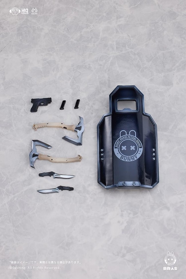 Action Figure (Completed Action Figure, Movable) The guardian of the team, the cute older sister character Guardian Elena is here! The second in the BUNNY BUNNY RAPID ACTION SQUAD series: the guardian of the team, the cute older sister character Guardian Elena is here! She comes with 4 replaceable face parts (smile, battle face, sparkling eyes and wink). She comes with 5 sets of replaceable hand parts (weapon holder (1), weapon holder (2), relaxed, grip, and posed). The pedestal can be used to store weapons and replacement parts. The figure uses the “KACHA” joints originally developed by Sushing, allowing for a wide range of movement. Elena, who plays an active role as a shield for the team, is a kind and reliable older sister. However, she also has a side that loves to drink! We hope you will welcome this charming girl into your life! Exclusive extras included with the initial run Replacement hand parts: Heart hand x 1 Dog tag x 1 Collection card x 1 Product Specifications Title BUNNY RAPID ACTION SQUAD Specifications 1/12 Complete painted articulated figure Some parts: Assembled plastic model Height: approx. 16.5cm Material: PVC/ABS/POM Sculptor Anadromous Sushing Color Anadromous Sushing Manufacturer Anadromous Sushing Distributor Good Smile Company (C)Sushing. All Rights Reserved. The photos shown are taken of a sample product. Some specifications may differ from the actual product. Due to the manual coloring process, there may be slight differences in the paint job of each product. Please understand this in advance. The images are for illustrative purposes only. Actual product may differ. (From Good Smile Company website)