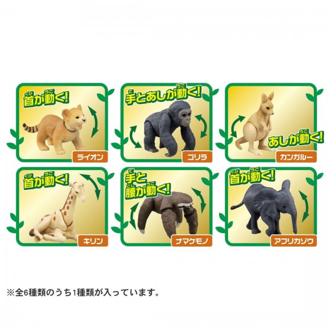 There are six types of figures in total: a lion cub, an African elephant cub, a giraffe cub, a sloth cub, a kangaroo cub, and a gorilla cub.