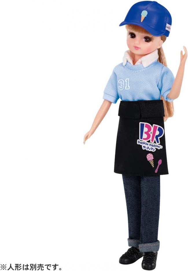 Uniforms that look just like the waitresses at Thirty-One Ice Cream Shops. Includes a menu card that can be detached from the base paper to play with, allowing children to enjoy playing store clerk. Set includes top, bottoms, apron, black sneakers and hat. Rica-chan Welcome! You can play with "Thirty-One Ice Cream Shop". Set includes: Top (1), Bottoms (1), Apron (1), Kuts (1), Hat (1), *Doll sold separately. (c) TOMY B-R Thirty-One Ice Cream Co.