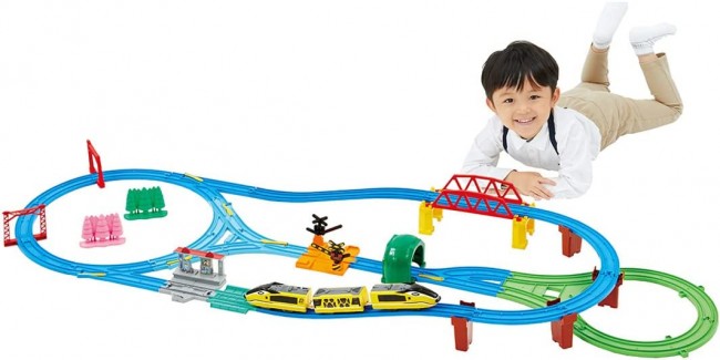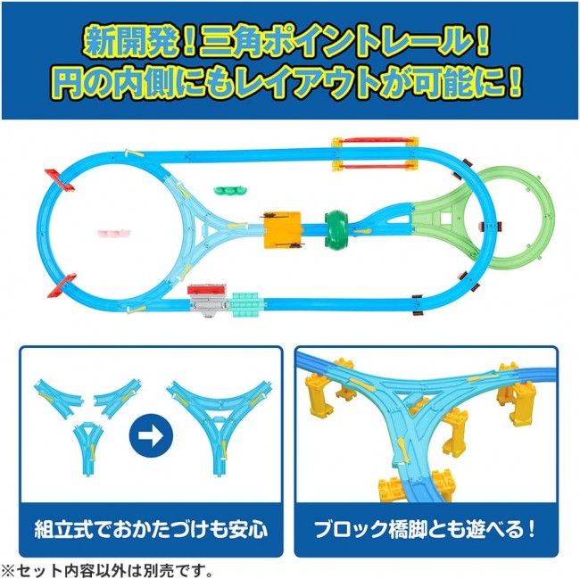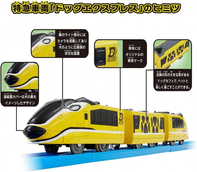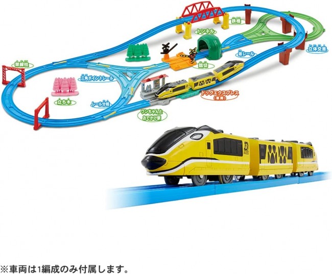 Model Railroad (Electric, Rail, etc.) Perfect for those who are just starting out! A large all-in-one set that you can play with right away! All popular layouts such as "Slope", "Crossing", "Station", "Railroad Crossing", and "Tunnel" are included! 22 parts in total! You can build more than 7 different layouts with this set alone! The train is the "Dog Express", an original new express train with a dog motif. The newly developed "triangular point rail" can be branched in three directions, allowing you to build an unprecedented new layout. The original "Doggy Station" is a cute station with ears and a dog stationmaster. This is a limited production product that will be available until December 2023. Product Contents Car body (Dog Express/3-car train) (1), straight rail (1), 1/2 straight rail (1), 1/2 stop rail (gray) (1), new slope rail (2), curved rail (6), 2x curved rail (1), turnout rail (1 each for L and R) (2), single track and double track point rail (B only) (1), triangle point rail (1 set) (1), U-turn rail (green 1 set) (1), block piers (2), PC piers (4), girder bridge (1), small steel bridge frame (2), single track overhead rail column (2), tunnel (2 parts) (1), railroad crossing (crossing base (1), alarm (2), blocking can (2 (2 parts) (1), Doggy and Outing Station (with Dog Stationmaster) (1), Standing timber (green semi-rigid) (1), Standing timber (pink semi-rigid) (1), Sticker (1), Instruction manual (1), Order form for parts (1) (C) TOMY (From TOMY website)