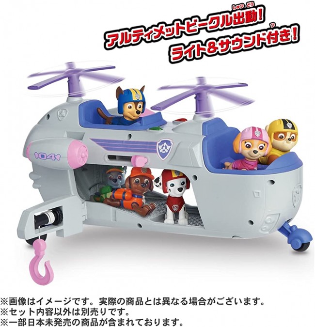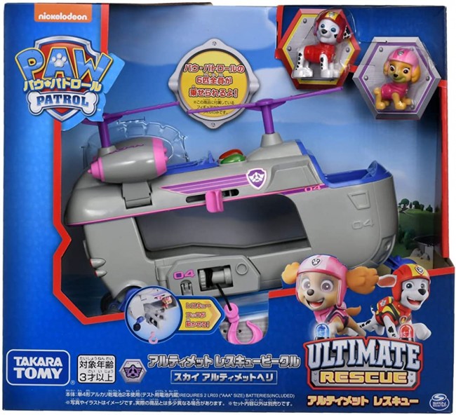Pow! Solve any trouble with Pow! Pow Patrol is on the move! The Ultimate Helicopter from the animated TV series "Ultimate Rescue" is now available! (1)Combines with the Ultimate Support Vehicle! Enjoy team rescue! (2)Lights and sounds! (3)Hooks move! (4)Engine moves! (5)Open the hatch and put figures on it! Contents] Main unit (1), Sky figure (1), Marshall figure (1), instruction manual (1) (c)2023 Spin Master Ltd. PAW PATROL and all related titles, logos, characters; and SPIN MASTER logo are trademarks of Spin Master Ltd. Nickelodeon and all related titles and logos are trademarks of Viacom International Inc. Uses 2 AAA alkaline batteries (batteries are built-in) REQUIRES 2 LR03 ("AAA" SIZE) BATTERIES(INCLUDED)