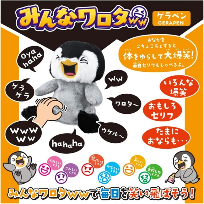 Happy things, sad things, let's laugh at them all with WWWWWW, everyone will laugh at you! This is a plush toy with action based on the theme of the addictive WWII laughter. Every time you tickle its tummy, it laughs out loud with comical movements! It laughs in a variety of ways, such as bursting out laughing, laughing, laughing, and losing laughter. Sometimes he even says funny lines or farts! Gerapen is voiced by popular voice actress Mayumi Tanaka! Let's laugh everyday with Minna Warota! Contents] Minna Warota (1) (C) TOMY Uses 3 AAA alkaline batteries (batteries sold separately) Please use alkaline batteries.